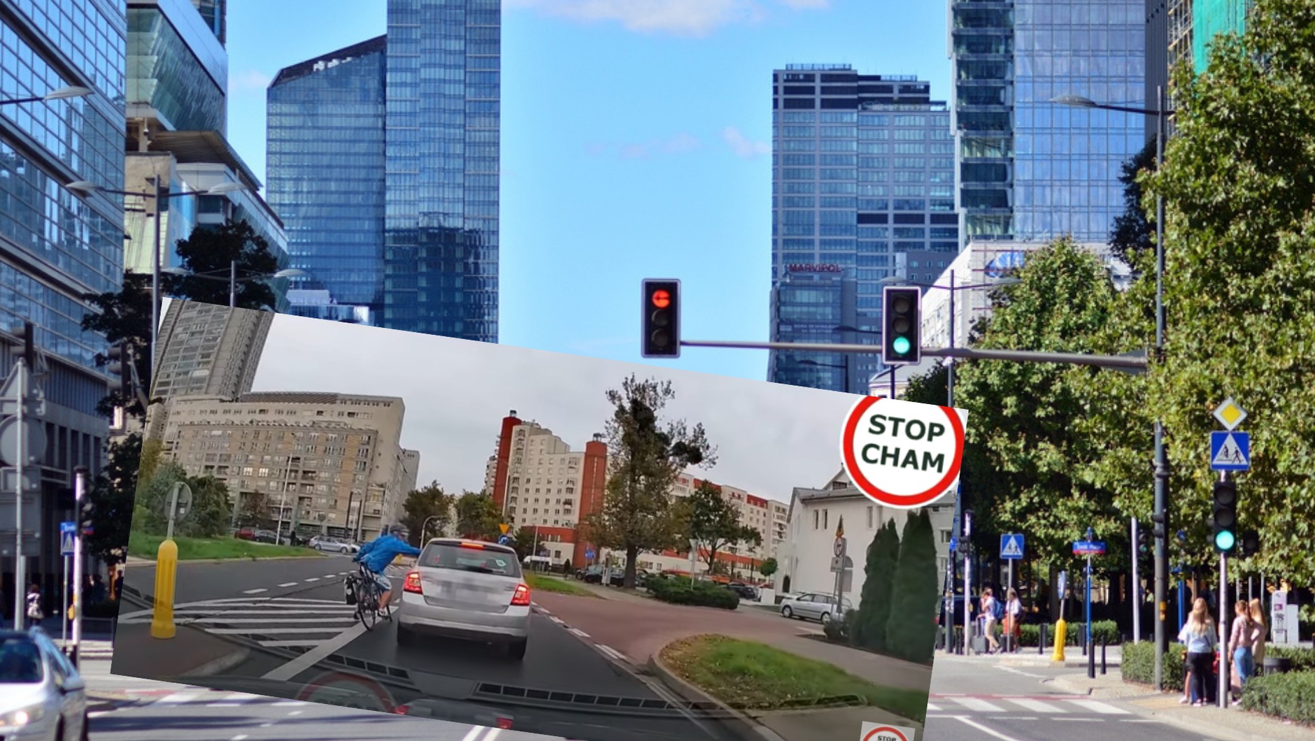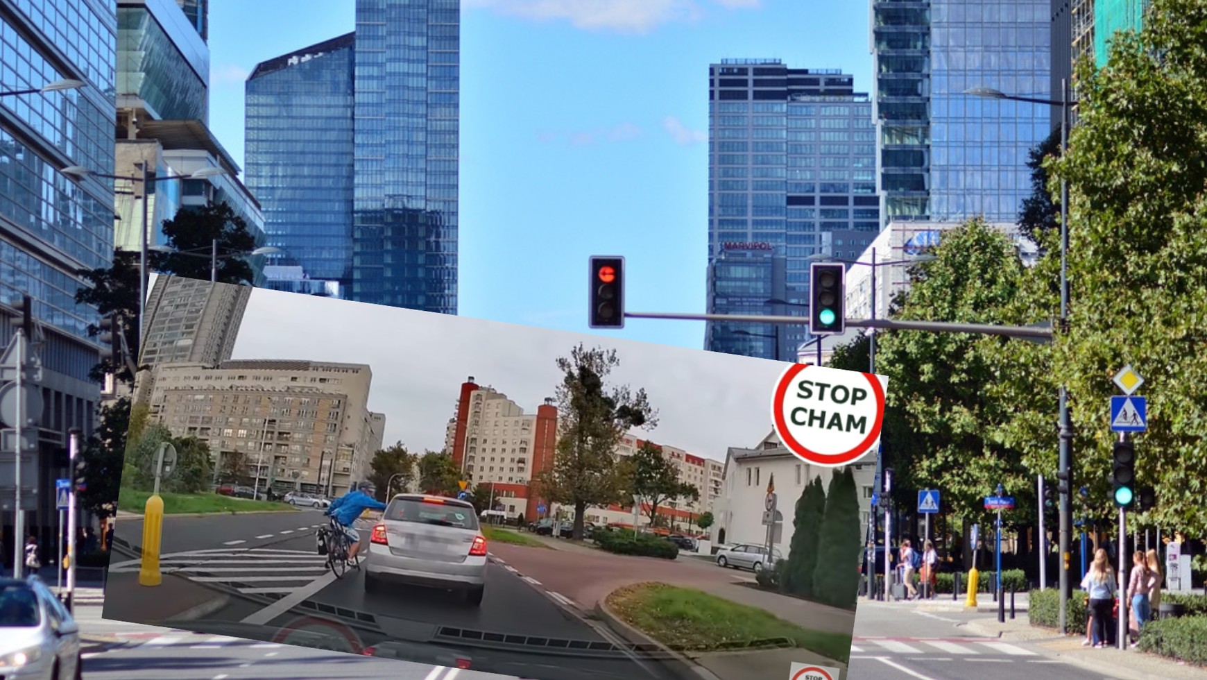 "Typowe zdarzenie w Warszawie. Rowerzysta, który myśli, że wszystko mu wolno. Jazda na wprost pasem do skrętu w prawo, agresywne zachowanie względem pani kierowcy ze Skody, a potem oczywiście przejazd na czerwonym po pasach. Taki to ma życie" - opisuje autor nagrania.