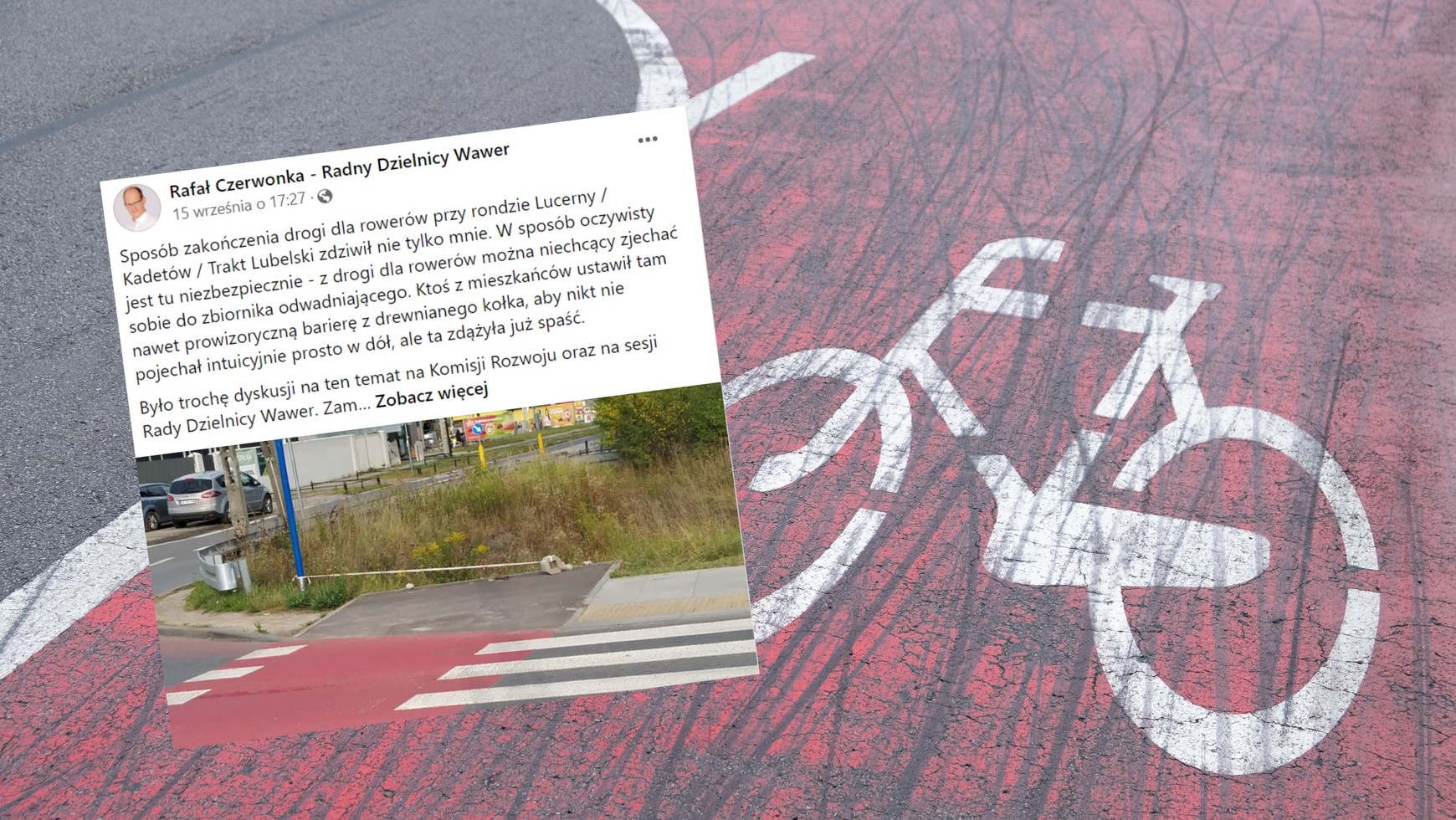 Na Facebooku pisze: "Sposób zakończenia drogi dla rowerów przy rondzie Lucerny/Kadetów /Trakt Lubelski zdziwił nie tylko mnie. W sposób oczywisty jest tu niebezpiecznie — z drogi dla rowerów można niechcący zjechać sobie do zbiornika odwadniającego. Ktoś z mieszkańców ustawił tam nawet prowizoryczną barierę z drewnianego kołka, aby nikt nie pojechał intuicyjnie prosto w dół, ale ta zdążyła już spaść" — napisał radny Czerwonka.