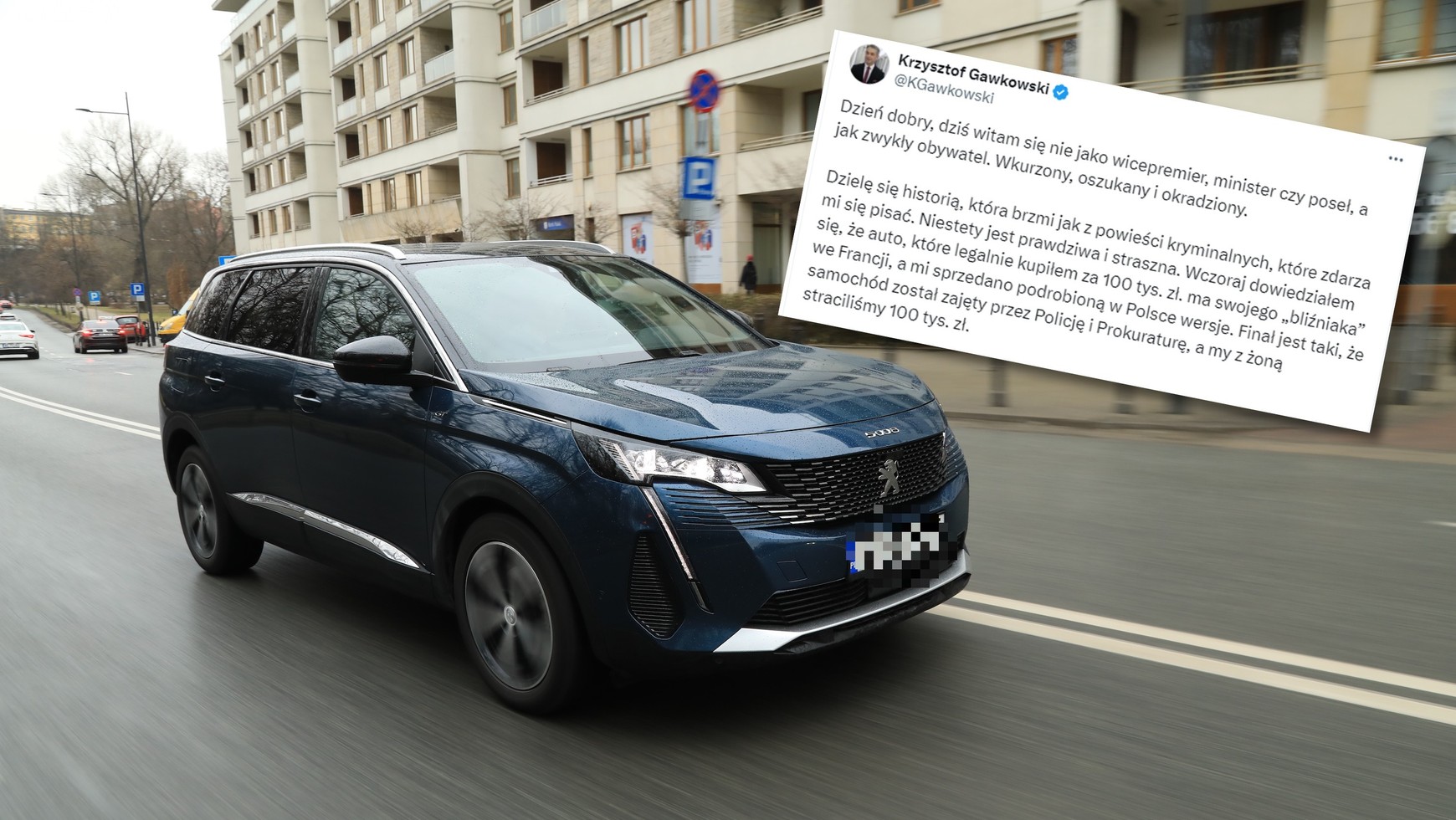 Poseł Nowej Lewicy, od grudnia 2023 r. wicepremier i minister cyfryzacji, w październiku 2023 r. kupił od prywatnej osoby eleganckiego SUV-a, Peugeota 5008. Przed kupnem zlecił sprawdzenie samochodu w autoryzowanym serwisie tej marki. Nic to nie dało – po kilku miesiącach zgłosiła się do niego policja i prokuratura: samochód pochodzi z przestępstwa, a najciekawsze jest to, że... auto ma brata bliźniaka w innym kraju. Co teraz?
