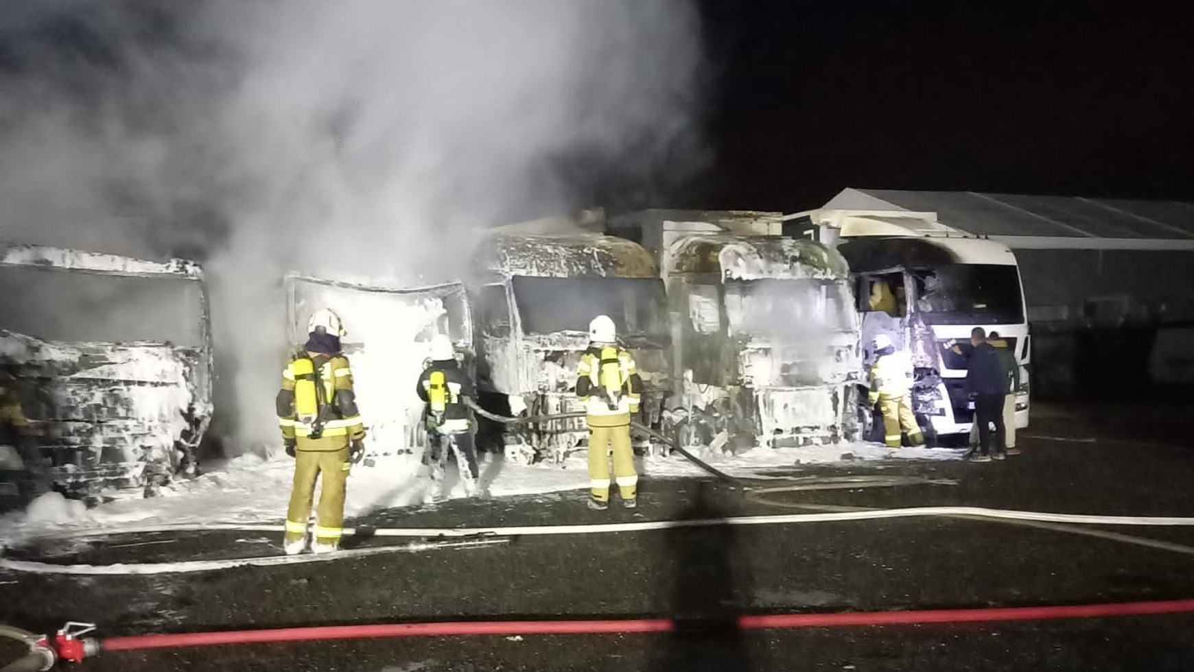 Strażacy zostali zadysponowani do akcji gaśniczej o godzinie 16:46, a gdy dojechali na miejsce zastali już mocno rozwinięty pożar czterech ciężarówek. Te pojazdy zostały zupełnie strawione przez ogień, a ponadto dwa kolejne zostały poważnie uszkodzone, a jeden ucierpiał w mniejszym stopniu, dzięki odciągnięciu go od reszty ciężarówek. Z ośmiu stojących pojazdów, tylko jeden zupełnie nie ucierpiał. Udało się go wyprowadzić, zanim dotarł do niego ogień. Nieznana jest suma strat, jednak są one ogromne.