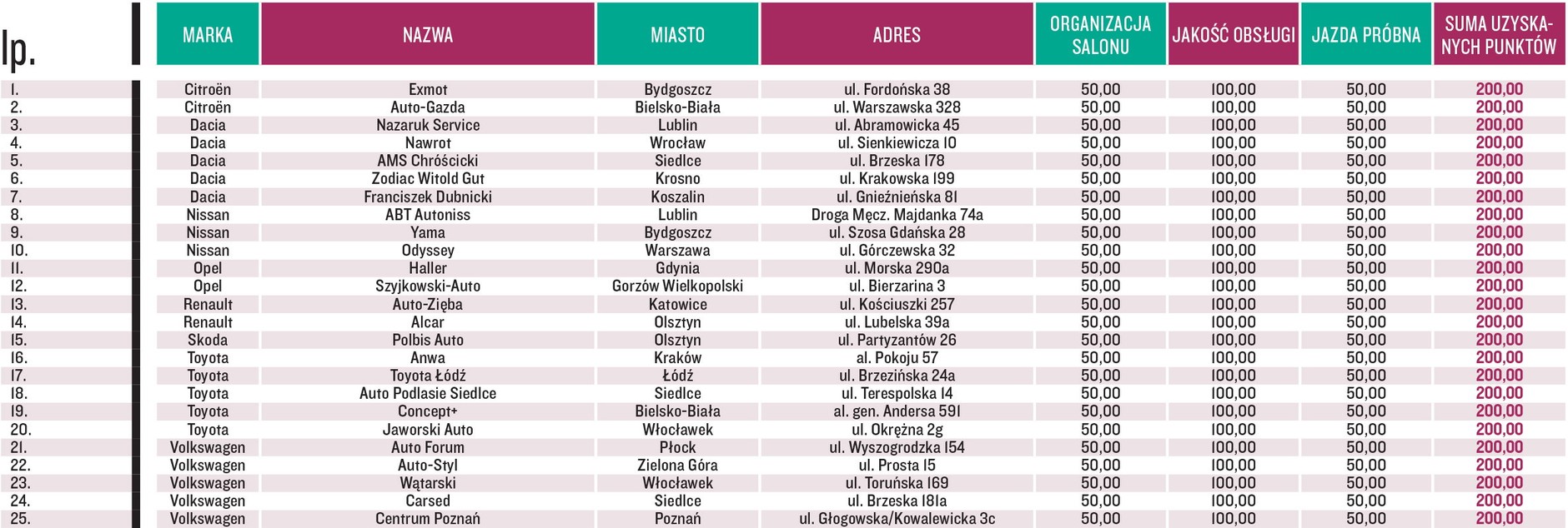 A oto najlepsi z najlepszych – salony, które uzyskały maksymalną liczbę 200 punktów. Pełne wyniki testu w 31 numerze „Auto Świata", który ukazał się z datą 27 lipca 2015 r.