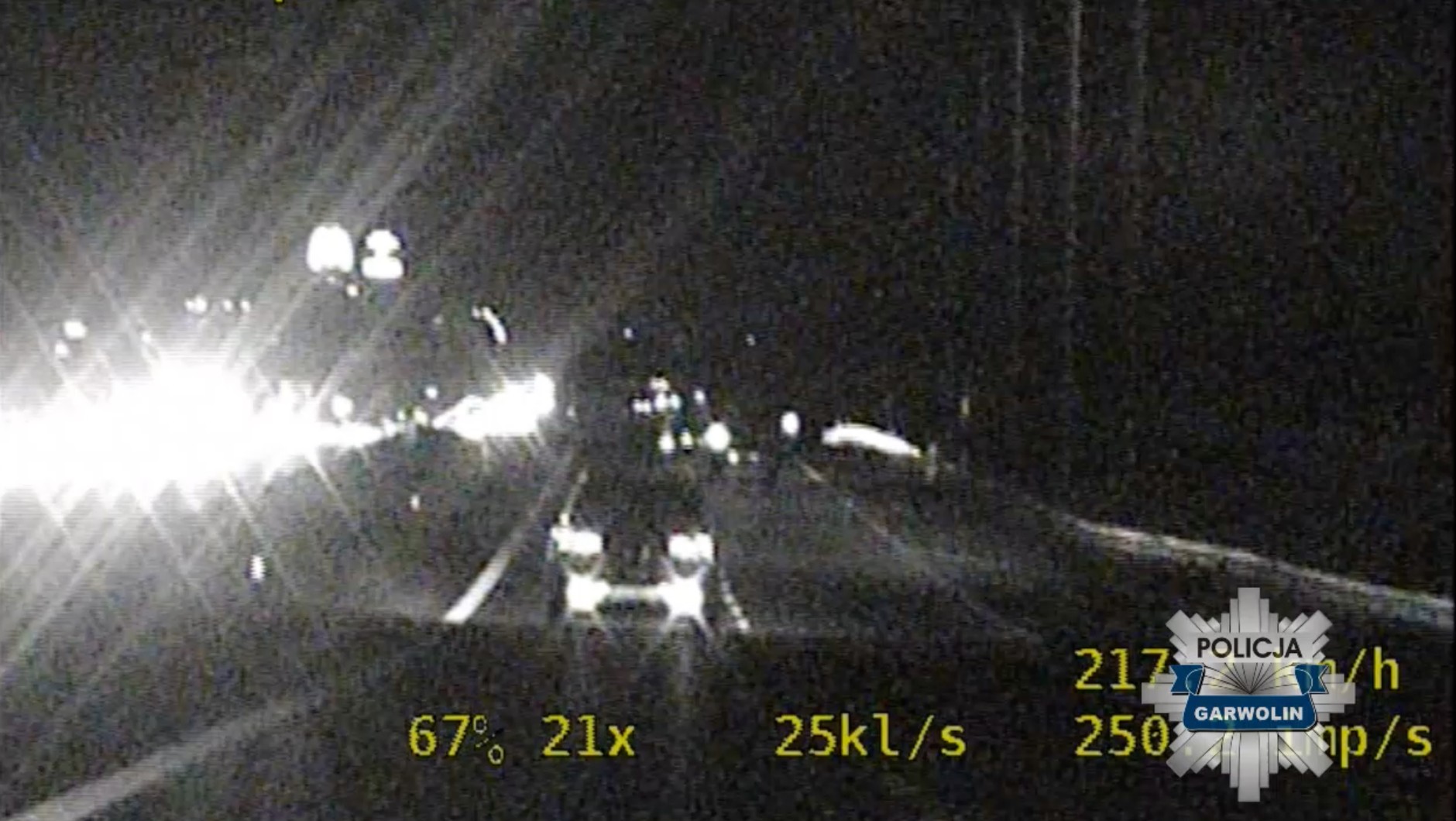 W czwartek (31 października) policjanci z garwolińskiej grupy Speed patrolowali drogę ekspresową S17. Około godz. 20 zatrzymali na trasie 36-latka jadącego samochodem marki Audi. Przyczyną kontroli było zignorowanie przez mężczyznę obowiązującego w tym miejscu ograniczenia prędkości do 120 km na godz. Na nagraniu z wideorejestratora widać, że kierujący pędził z prędkością 215 km na godz. Jakby tego było mało 36-latek, włączając światła drogowe, zmuszał innych kierowców, aby zjeżdżali mu z drogi.