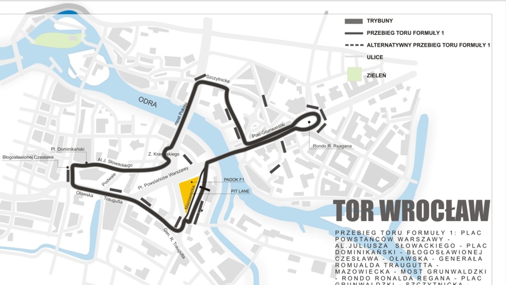 Bolidem przez miastoSercem toru jest Plac Powstańców Warszawy i most Grunwaldzki. To tu zlokalizowano aleję serwisową, prostą start - meta i trybuny główne. Charakterystyczne dla przebiegu jest dwukrotne przekroczenie Odry Mostem Pokoju i Grunwaldzkim skąd roztacza się widok na stare części miasta. Ustalono, że bolidy będą poruszać się zgodnie z ruchem wskazówek zegara. Elementami charakterystycznymi przebiegu toru są: od północy Most Pokoju z wjazdem wyznaczanym przez budynki Muzeum Narodowego i Urzędu Wojewódzkiego. Od wschodu Rondo Reagana z nowoczesną zabudową, od południa kampus Politechniki Wrocławskiej, a od zachodu - Galeria Dominikańska i właśnie budowany, futurystyczny hotel Hilton. Na terenach pomiędzy Placem Powstańców Warszawy a ulicą Mazowiecką przewidziano budowę strefy serwisowejwraz zzabudowaniami zespołu obsługi wyścigu i centrum medialnego. Dwukondygnacyjna zabudowa alei serwisowej poprowadzona zostałaby wzdłuż ulicy. Tam na czas wyścigu znajdowałyby się garaże zespołów Formuły 1, a nad garażami pomieszczenia obsługi. Centrum Medialne zlokalizowano w obrębie placu Generała Walerego Wróblewskiego. Na rozległym terenie naprzeciwko wejścia do Urzędu Marszałkowskiego zaplanowano lokalizację trybun głównych. Według pierwszych testów maksymalna prędkość bolidów na torze sięga 296 km/godz., a czas okrążenia oscylowałby wokół 1 min. i 32 sek.