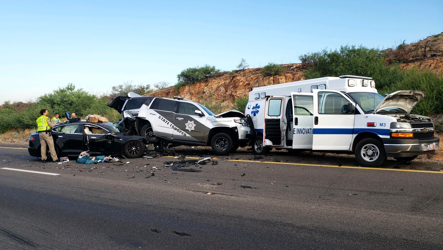 Pewne jest jedno – na autostradzie, nieopodal miejscowości Benson w stanie Arizona, w zaparkowany na poboczu radiowóz wbiła się Tesla S, za kierownicą której siedział właśnie nasz bohater. Siła uderzenia była na tyle duża, że radiowóz uderzył jeszcze w tył stojącego nieopodal ambulansu. Siedzącym w karetce osobom na szczęście nic się nie stało.