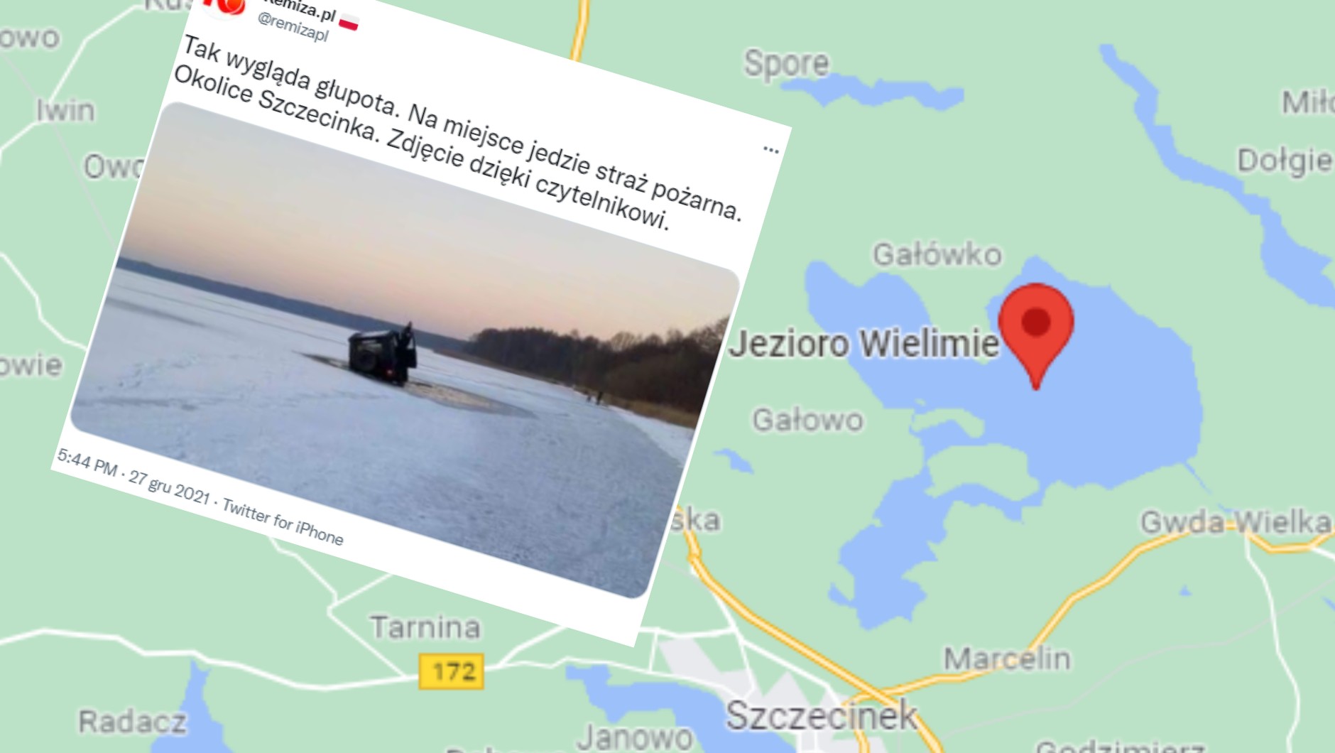 Do niecodziennego zdarzenia doszło w poniedziałek po południu nieopodal Szczecinka. Świadkowie relacjonują, że terenowy Mercedes z nieustalonych nadal powodów wjechał na zamarznięte jezioro Wielimie. Autem podróżowały dwie osoby, które początkowo samodzielnie próbowały się wydostać z topiącego się pojazdu. Pod jednym z kół załamał się lód.