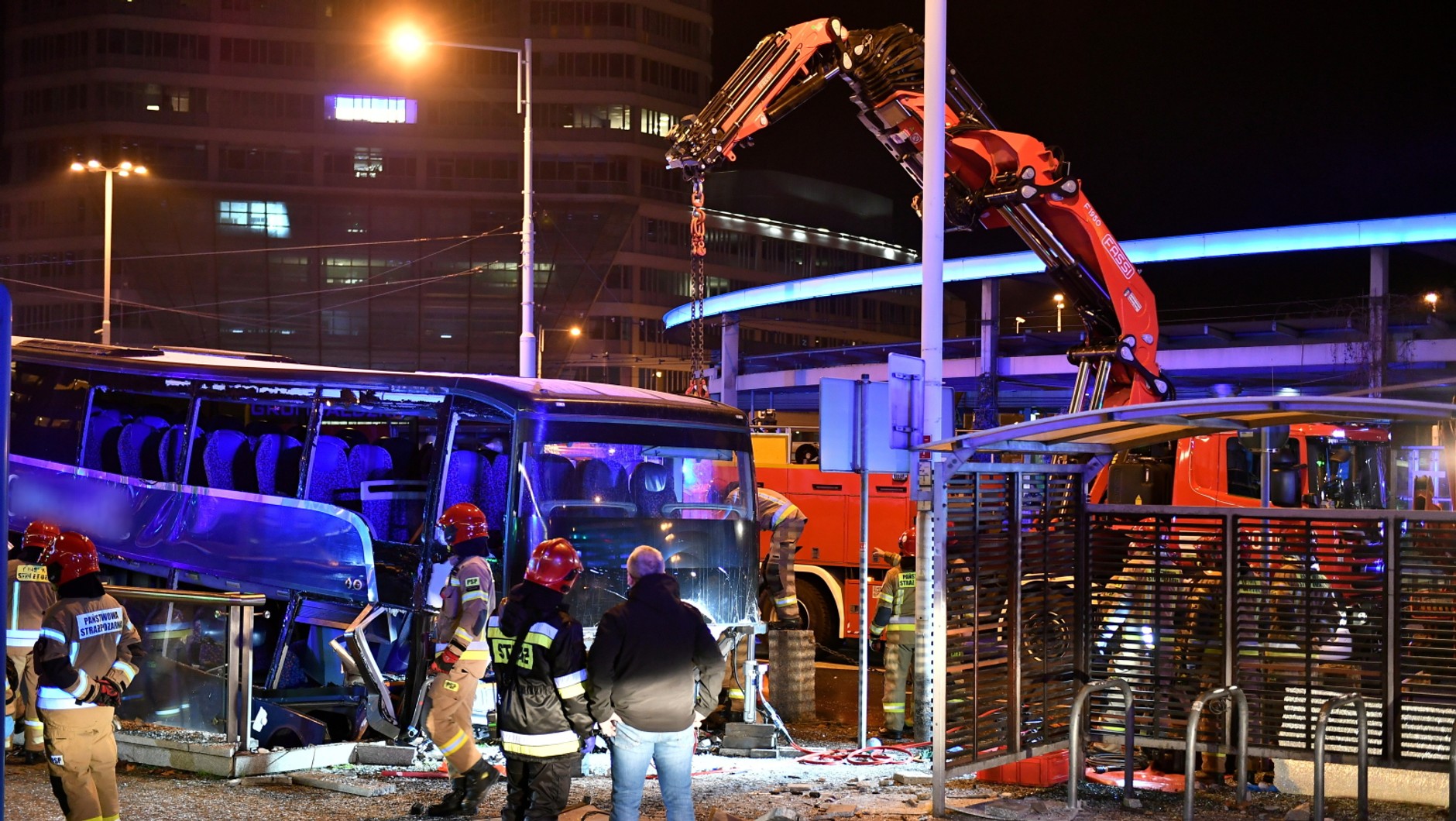 Niestety betonowa krawędź stropu przejścia trafiła prosto w kabinę kierowcy, zakleszczając go. Służby ratownicze zmuszone były do rozcięcia autokaru, co zajęło cenny czas. Kierowca mimo reanimacji zmarł w wyniku poniesionych obrażeń. Do szpitala trafiło także dwoje pasażerów autokaru, ich życiu nie zagraża niebezpieczeństwo.