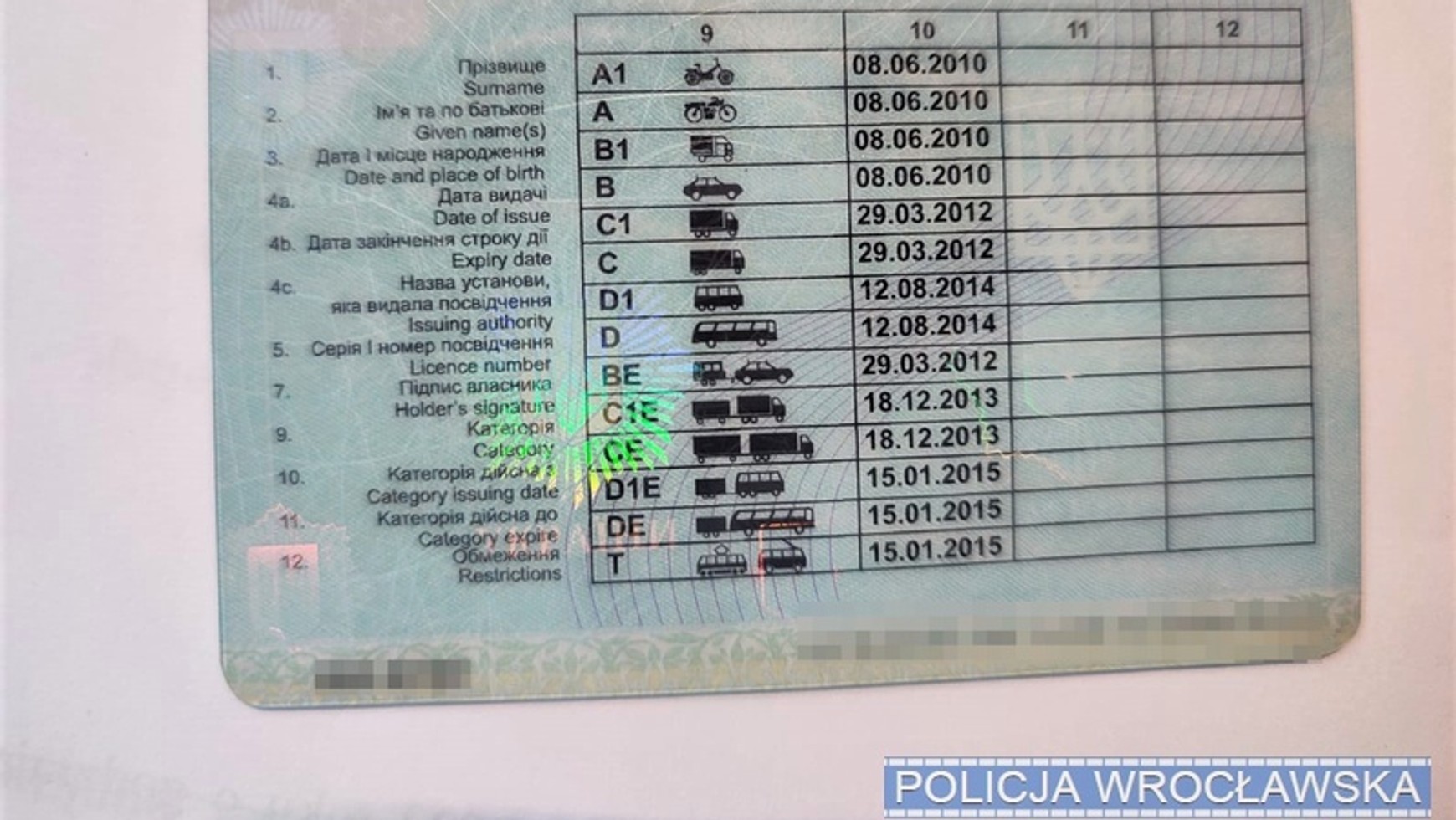 A to był dopiero początek licznych zwrotów akcji. Policjanci nabrali również podejrzeń co do prawdziwości prawa jazdy, które okazał 41-letni kierowca. I faktycznie, po zbadaniu dokumentu specjalną lampą ze światłem ultrafioletowym nie było widać wymaganych zabezpieczeń, a dodatkowo dokument ma niskiej jakości druk i wyglądem odbiega od oficjalnego wzoru. Nieścisłości potwierdził sam kierowca, który przyznał, że dokument kupił w Ukrainie (zadbał przy tym, aby mieć wszystkie kategorie — nawet na tramwaje!), ponieważ oryginał został zatrzymany przez policję.
