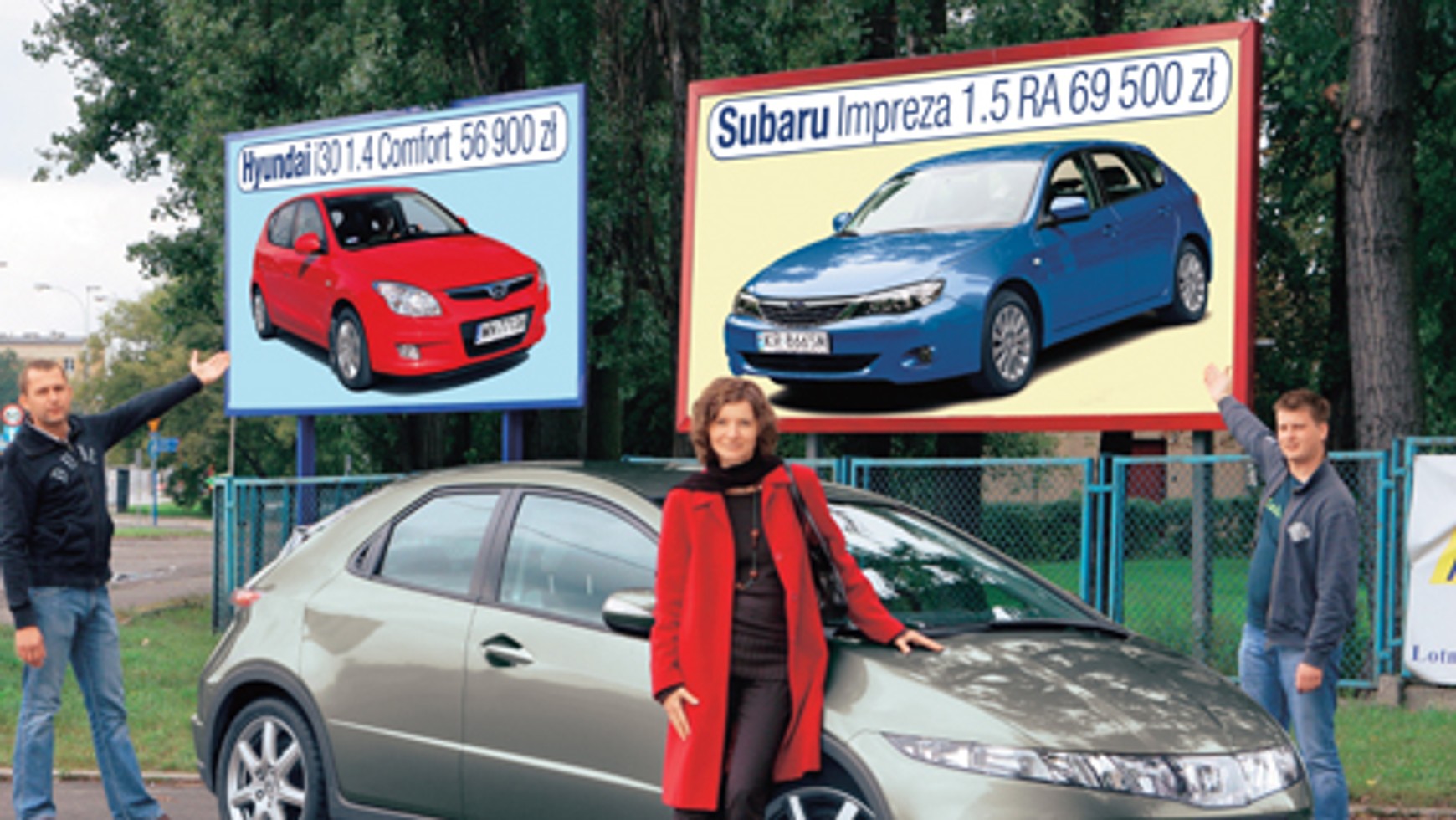 2001, przebieg 87 tys. km) spisuje się znakomicie, Aneta postanowiła zamienić go na nowy. Z sympatii do marki wybrała najnowszą wersję. Obejrzała auto w salonie, odbyła jazdę próbną i zakochała się w nowym Civicu. Radość zmąciła tylko wiadomość o wysokiej cenie i gorszych osiągach w stosunku do poprzednika. Zwróciła się do nas, byśmy pomogli jej dokonać właściwego wyboru. Na początku musieliśmy określić, do jakich celów będzie auto służyć. W grę wchodzą dojazdy do pracy (ok. 80 km dziennie), odwożenie dziecka do przedszkola, weekendowe wypady za miasto oraz dwa razy w roku podróże wakacyjne. Ustaliliśmy, że będzie to pięciodrzwiowe auto klasy kompakt, najlepiej z silnikiem benzynowym o mocy około 100 KM. Samochód nie może kosztować więcej niż 70 tys. zł i koniecznie musi mieć dobre wyposażenie, m.in. 6 airbagów, klimatyzację, radio z CD/MP3. Na początku postanowiliśmy przyjrzeć się pojazdowi, który wybrała nasza koleżanka. By sprostać powyższym wymaganiom, wybraliśmy Civica 1.4 Comfort. Z podstawowej wersji Base musieliśmy zrezygnować, gdyż nie miała seryjnej klimatyzacji i fabrycznego radia. Na większy silnik 1.8 140 KM Anety nie było stać (od 71 400 zł). Civic od pierwszego wejrzenia wpadł jej w oko. Nie ma się czemu dziwić, auto ma zgrabną, nowoczesną sylwetkę o futurystycznych kształtach. Oryginalnie wykonane jest także wnętrze, które bardziej przypomina pojazd kosmiczny niż samochód. Początkowo zaskakuje rozmieszczenie przełączników - zwłaszcza umieszczonego po lewej stronie kierownicy przycisku do uruchamiania silnika. Na centralnym miejscu wśród wskaźników umieszczono analogowy obrotomierz. Tuż nad nim jest cyfrowy prędkościomierz. Niestety, niektórym pasażerom obserwowanie jego wskazań będzie ograniczała kierownica. To niejedyne kłopoty z widocznością w tym samochodzie. Z powodu szerokich słupków tylnych i spoilera na tylnej szybie - pozbawionej w dodatku wycieraczki - cofanie Civikiem nie należy do łatwych czynności. Mogą je wspomóc czujniki, które za dopłatą ok. 1000 zł powinien zamontować diler. Mimo tych kilku wad wnętrze Civica ma wiele zalet. Przede wszystkim jest niezwykle obszerne. Zaskakuje zwłaszcza ilością miejsca na tylnej kanapie, gdzie wysocy pasażerowie mają dużo wolnej przestrzeni na nogi. Narzekać mogą jedynie na nisko schodzący ku tyłowi dach, który będzie przebiegać tuż nad ich głowami. Także zajmowanie miejsc na tylnej kanapie nie należy do najłatwiejszych. Czynność tę utrudniają wąskie drzwi. Za to z bagażami nie ma najmniejszych kłopotów. 456-litrowy kufer pozwala zabrać ekwipunek wakacyjny bez zbytnich wyrzeczeń. Rozkładanie tylnych foteli jest wręcz wzorowe. Wystarczy tylko pochylić do przodu oparcie, a siedzisko przy użyciu mechanizmu obniży się, dzięki czemu jednym ruchem ręki tworzymy płaską podłogę bagażnika. Z kolei gdy chcemy przewieźć wysokie przedmioty, wystarczy podnieść siedzisko tylnej kanapy do góry, a powstała w ten sposób powierzchnia pozwoli umieścić w tym miejscu choćby rower. Wydając prawie 65 tys. zł na kompaktowy model, należałoby oczekiwać, że auto będzie miało dynamiczny silnik. 1,4-litrowa jednostka wykonana w technice dwóch zaworów na cylinder owszem sprawdza się, ale w mniejszym Jazzie lub City. W Civicu 83 KM muszą zmierzyć się z większą masą auta, co przekłada się na gorsze przyspieszenie. Co ciekawe, silnik 1.4w nowym Civicu mimo identycznej pojemności jak w poprzedniku ma mniejszą o 7 KM moc.Auto rozpędza się do 100 km/h o prawie 3 s wolniej. Sytuację ratuje nieco niższe spalanie (o 0,5 l/100 km). Skrzynia biegów, tradycyjnie już dla Hondy, pracuje wzorowo. Skoki lewarka są krótkie, a wybór przełożeń precyzyjny. Nie każdemu przypadnie do gustu zawieszenie nowego modelu. Samochód prowadzi się świetnie, w czym pomaga precyzyjny układ kierowniczy, ale komfort resorowania nie jest wysoki. Zwłaszcza w porównaniu z poprzednikiem. Prezentowana wersja Comfort ma bogate wyposażenie. Oprócz wspomnianych 6 airbagów jest w niej seryjny układ kontroli stabilności jazdy VSA (odpowiednik ESP). Mimo to cena auta jest wysoka. Po dokładnym przyjrzeniu się nowemu Civicowi postanowiliśmy zrobić krótkie podsumowanie. Na korzyść tego modelu przemawia atrakcyjne nadwozie z ciekawym i przede wszystkim przestronnym wnętrzem. Mankamentami są: wysoki koszt zakupu, mało dynamiczny silnik, ograniczona widoczność oraz twarde zawieszenie. Po powyższej dawce informacji Aneta zaczęła się wahać, czy wybór nowego Civica będzie słuszny. By jej pomóc, przedstawiliśmy alternatywne propozycje, a dokładniej dwa auta z tej samej klasy. Pierwszym z nich jest tegoroczna nowość Hyundai i30 ze 109-konnym silnikiem 1.4. Drugą opcją jest świeżutka na rynku czteronapędowa Impreza z podstawowym motorem 1.5 (107 KM). Wybór Hyundaia podyktowany byłby głównie aspektem ekonomicznym. Samochód jest po pierwsze, tańszy od Hondy o 8 tys. zł, a po drugie,ma mocniejszy o 26 KM silnik. Niestety, atut cenowy jest tylko pozorny. Poziom wyposażenia i30 jest znacznie uboższy. Brakuje automatycznej klimatyzacji i systemu ESP. Jest bogatszy jedynie o światła przeciwmgielne i sterowanie radiem z koła kierownicy. Mimo jednakowej pojemności jednostka Hyundaia uzyskuje znacznie lepsze osiągi. W sprincie do "setki" rozpędza się o 2,9 s szybciej. Dynamiczna jazda wymaga jednak utrzymywania silnika na wysokich obrotach, co wiąże się z podwyższonym poziomem hałasu. Większa moc sprawia natomiast, że auto jest bardziej paliwożerne, choć trzeba przyznać, że różnice w codziennej jeździe będą niezauważalne. Skrzynia biegów pracuje poprawnie. Biegi przekładają się lekko, choć skoki lewarka mogłyby być krótsze, a wybór precyzyjniejszy. Bardzo korzystnie wypada Hyundai w dziedzinie przestronności. Na przednich fotelach oferuje