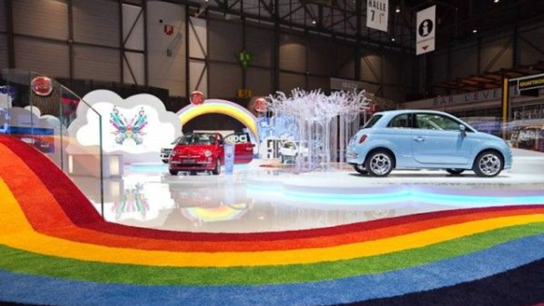 To wesołe i tętniące życiem miejsce przedstawiało domy zbudowane na chmurach, natomiast gości odwiedzających ten "świat Fiata" witała właśnie tęcza.