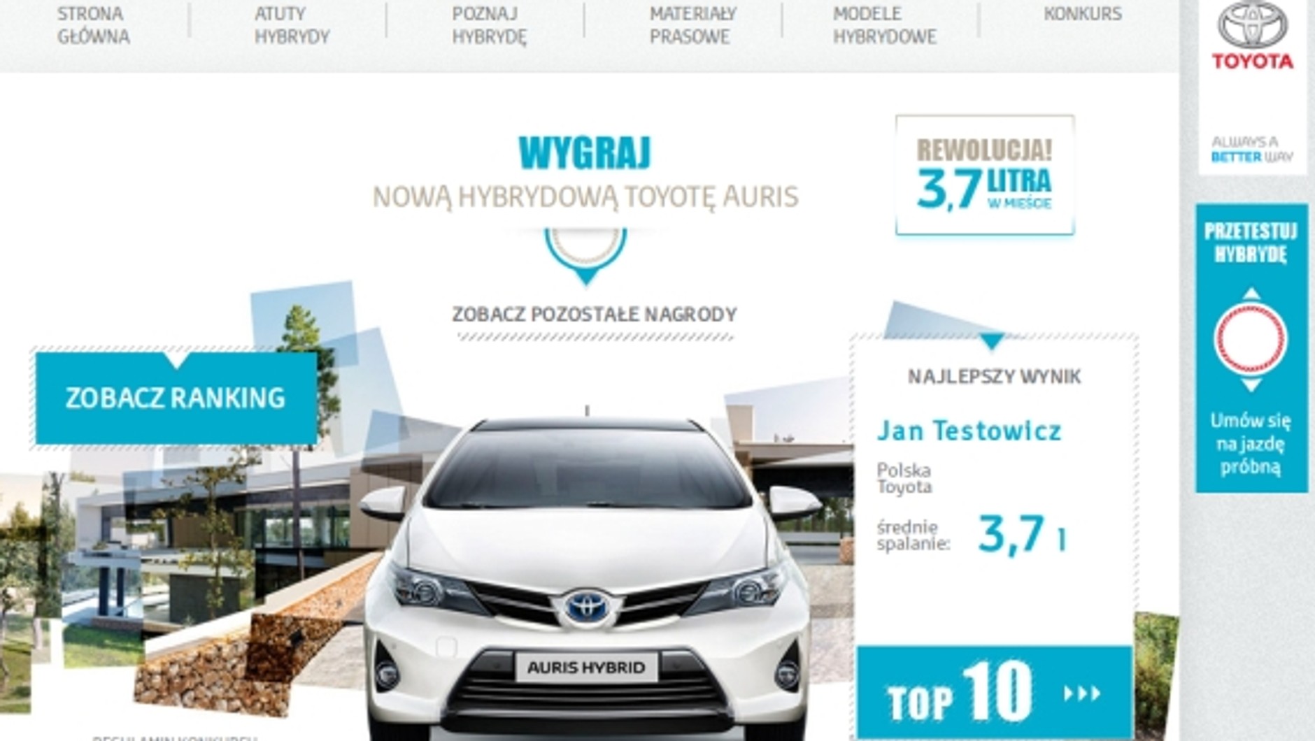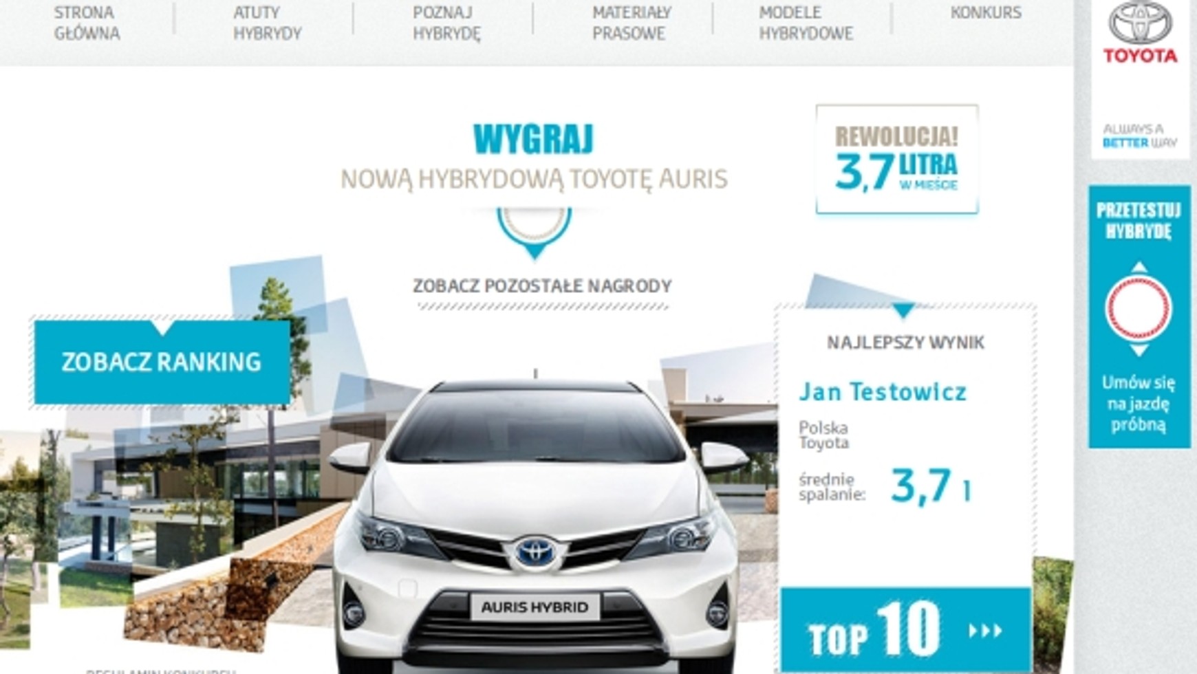 W sobotę 13 kwietnia rusza 3-miesięczny konkurs jazd ekonomicznych, w którym główną nagrodą jest Toyota Auris Hybrid. Każdy, kto odwiedzi Autoryzowaną Stację Dilerską Toyoty będzie mógł odbyć jedną jazdę konkursową, podczas której sprzedawca sprawdzi na stałym dla wszystkich uczestników danej stacji odcinku trasy średnie spalanie oraz czas przejazdu i dystans. Jazdę konkursową można odbyć tylko raz, nie można do niej podchodzić na innej stacji.