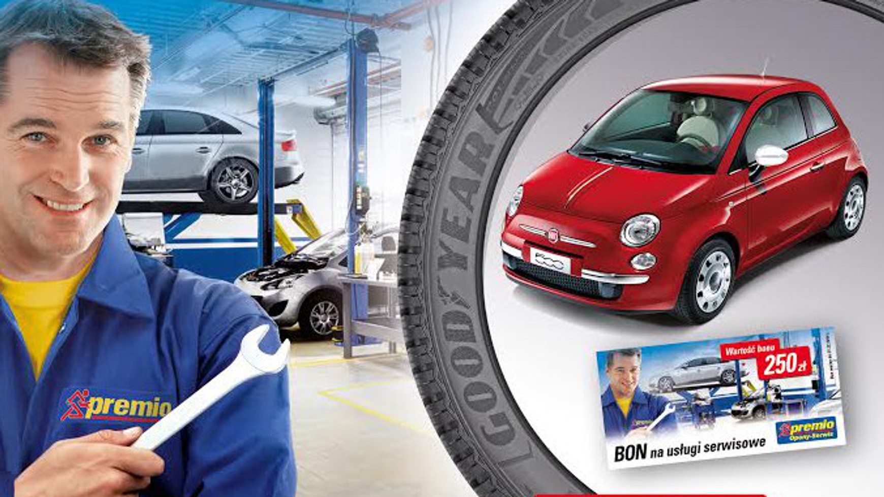 Dzięki akcji promocyjnej, którą organizuje sieć serwisów oponiarskich Premio, można wygrać cenne nagrody. Najcenniejszy jest Fiat 500, ale kolejnych 112 osób otrzyma bony na uslugi warsztatowe o wartości 250 zł każdy.