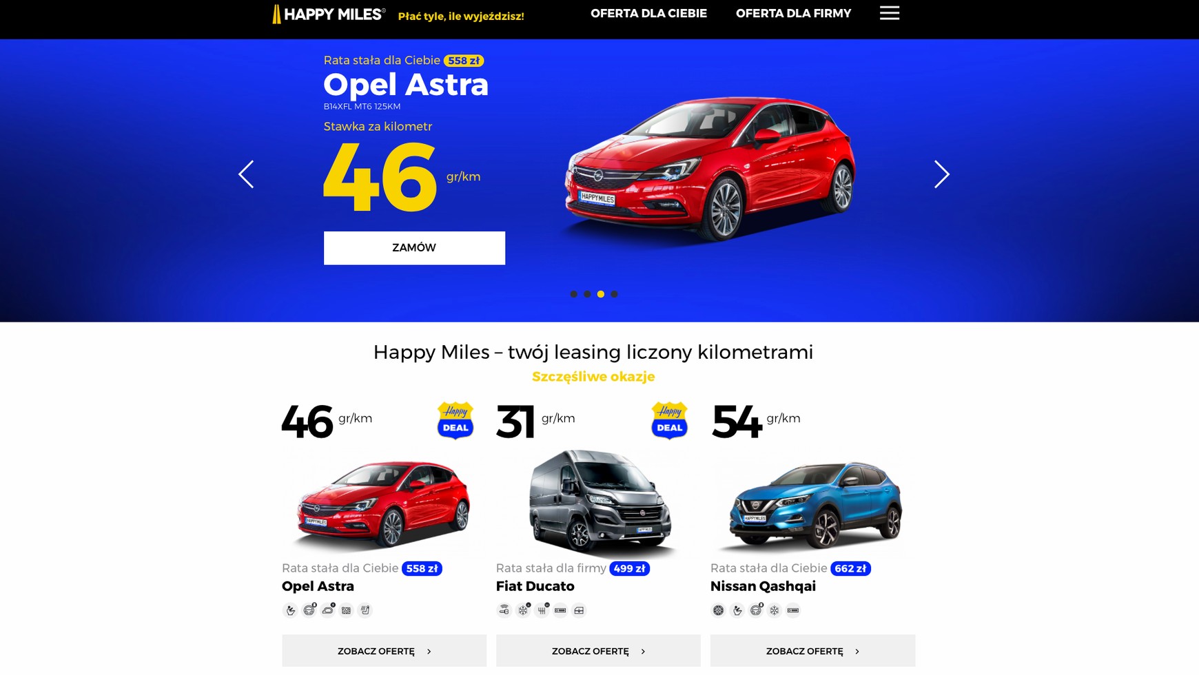 Dzięki niej możesz mieć nowy samochód nawet co dwa lata, nie martwiąc się o jego serwisowanie, kupno opon zimowych czy późniejszą odsprzedaż. Taki nowoczesny sposób na użytkowanie samochodu można znaleźć na nowej platformie Happy Miles, która bez wychodzenia z domu pozwala na zmianę samochodu na nowy. Kilka kliknięć na happymiles.pl, ustalenie szczegółów przez telefon i nowe auto w niedługim czasie pojawi się pod wskazanym przez nas adresem. Do wyboru jest szeroka oferta popularnych modeli samochodów na polskim rynku.