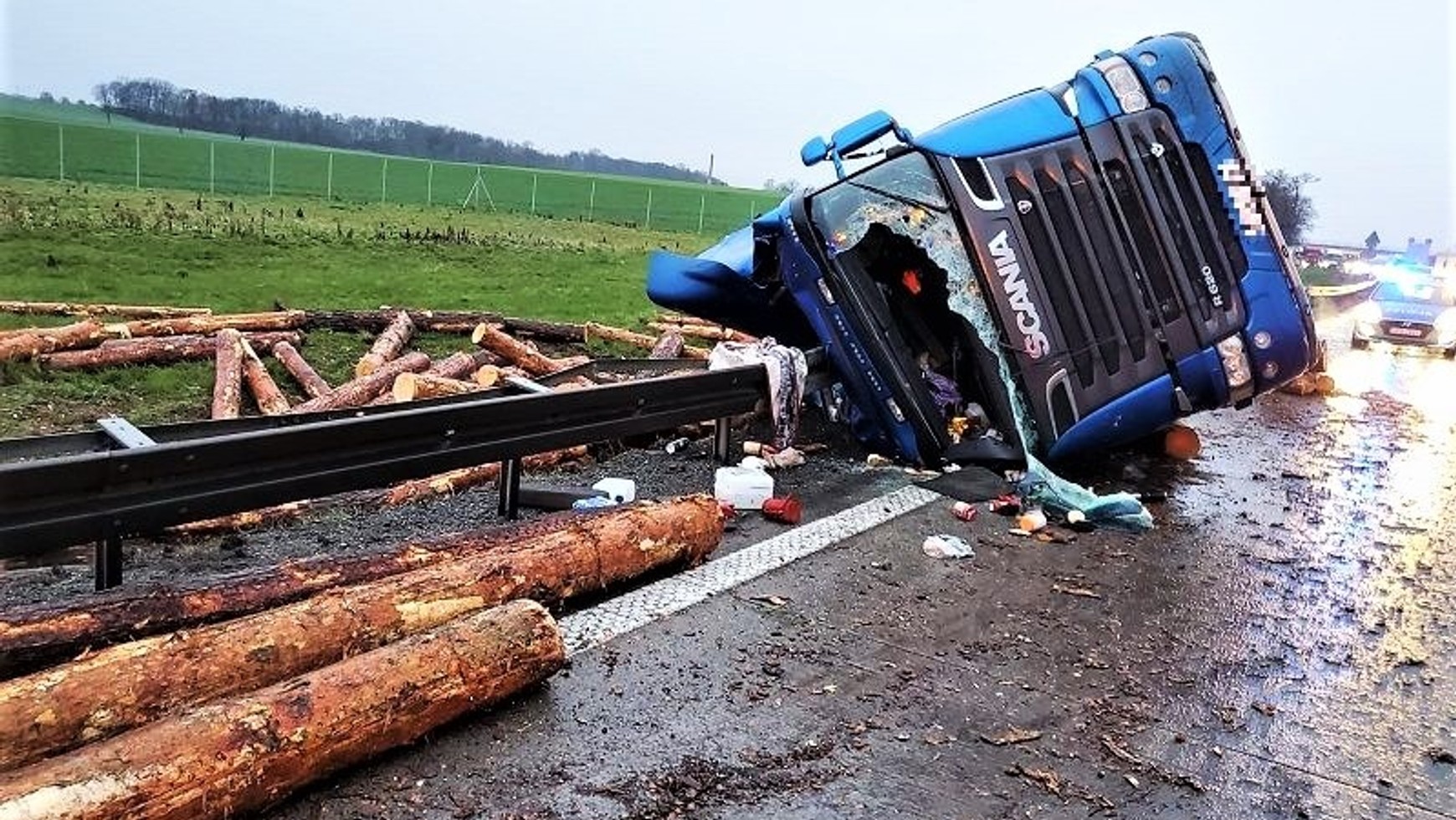 Jak poinformowała wrocławska policja, do tego zdarzenia doszło na 141 kilometrze autostrady A4 w piątek 16 kwietnia po godz. 18.30. Nieodpowiedzialny kierowca ciężarówki przewożącej drewno stracił panowanie nad pojazdem, przebił barierę i zakończył jazdę na boku, a z naczepy wysypały się wielkie i ciężkie bale drewna.