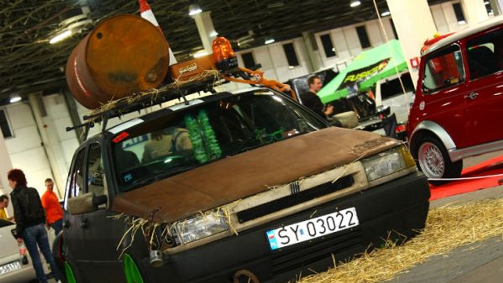 Matowy lakier, maska pokryta rdzą - to pierwsze co rzuca się w oczy. Jednak zmiany wykonane przez właściciela idą znacznie dalej. Samo obniżenie samochodu pochłonęło bardzo dużo czasu. Ponieważ zestaw obniżający do Fiata Tipo nie był dostępny na rynku. Po wielu próbach i przymiarkach ostatecznie do samochodu trafił zestaw amortyzatorów i sprężyn dedykowany do Hondy CRX. Jednak to nie wszystko. Czym byłby tuning bez ładnych Alu- felg. I znów przewrotnie w tym przypadku są to jednak poszerzane felgi stalowe! I jest to efekt zamierzony, a nie jak by się mogło wydawać "budżetowa modyfikacja". Zostały pomalowane w kolorze jaskrawej zieleni - tak samo jak silnik. Efekt końcowy podkreślają lusterka i grill obłożone płótnem czy drewniany bagażnik dachowy z zardzewiałą beczką i pomarańczowym pachołkiem. Każdy element samochodu, jak np. krzywo powieszona tablica rejestracyjna czy słoma wystająca spod maski jest efektem zamierzonym i trzeba przyznać, że idealnie pasuje do całości projektu.