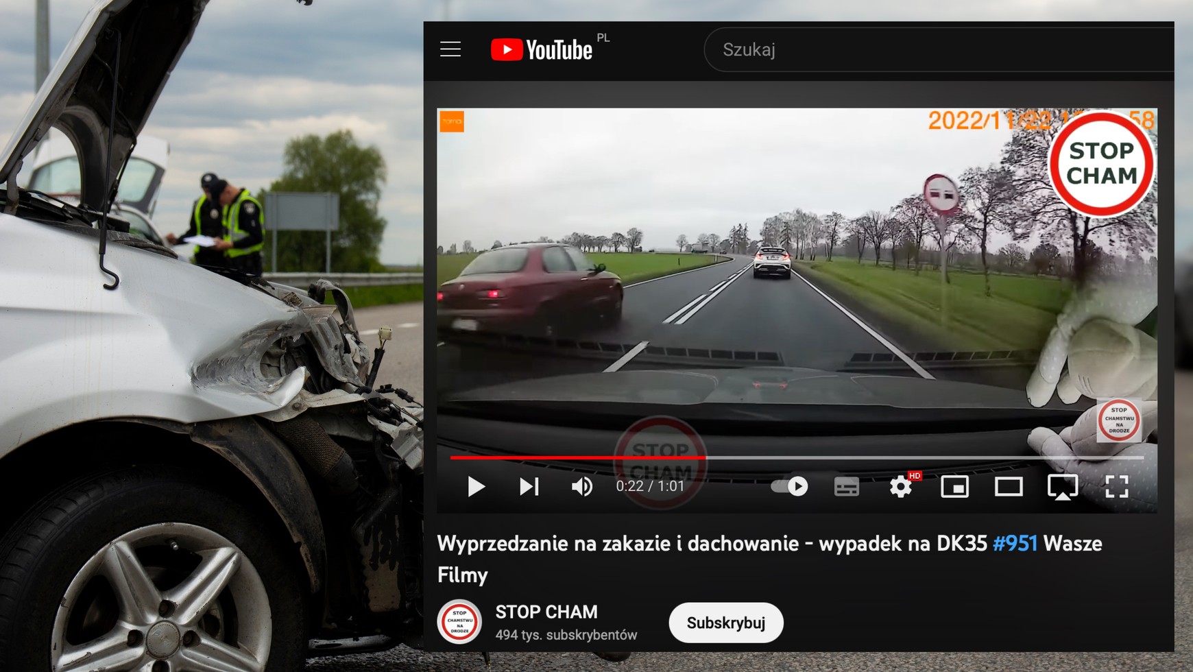 Droga krajowa nr 35 pomiędzy Świdnicą i Wrocławiem. W kierunku stolicy Dolnego Śląska, jak widać na nagraniu udostępnionym na kanale "Stop Cham" na YouTube, jedzie biała Toyota, a zaraz za nią autor nagrania. W pewnym momencie oba samochody zostają wyprzedzone przez kierowcę Alfy Romeo. Co ważne, dzieje się to przy obowiązującym zakazie wyprzedzania i w miejscu, gdzie na jezdni znajduje się podwójna linia ciągła.