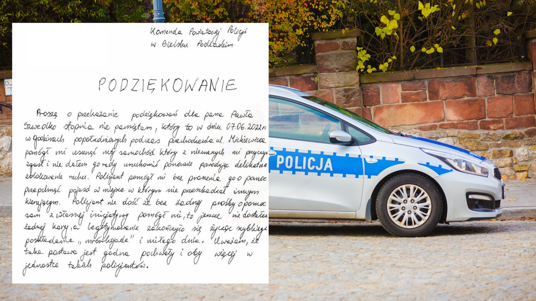 Mieszkaniec Bielska Podlaskiego podziękował Pawłowi Szwedko, policjantowi z ruchu drogowego, za nietypową pomoc oraz brak kary. Kiedy na początku czerwca 2022 r. jego samochód zepsuł się przy ul. Mickiewicza i blokował ruch, funkcjonariusz przyszedł mu z pomocą.