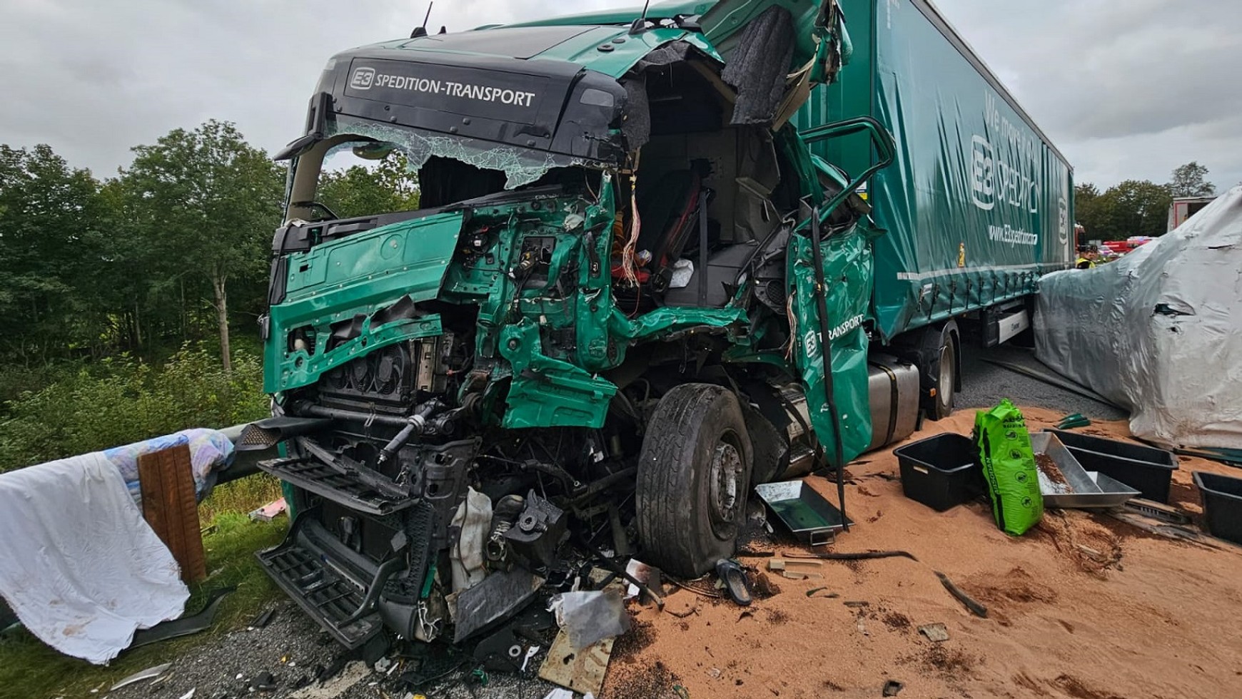 Dalszy ciąg artykułu pod materiałem wideoJak poinformował serwis foerde.news sprzęt przebił ścianę naczepy i uderzył w kabinę nadjeżdżającej z przeciwka ciężarówki, a następnie spadł na jezdnię. Siła uderzenia była ogromna. W wyniku zderzenia kabina nadjeżdżającego pojazdu została mocno zniszczona, uwięziony został także prowadzący ją kierowca. Wydobycie ciężko rannego mężczyzny zajęło służbom ok. 1,5 godziny.