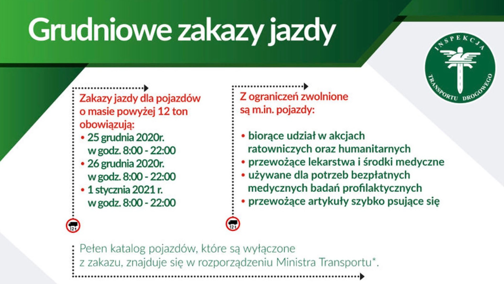 Zakazy ruchu w okresie świąteczno-noworocznym będą obowiązywały: