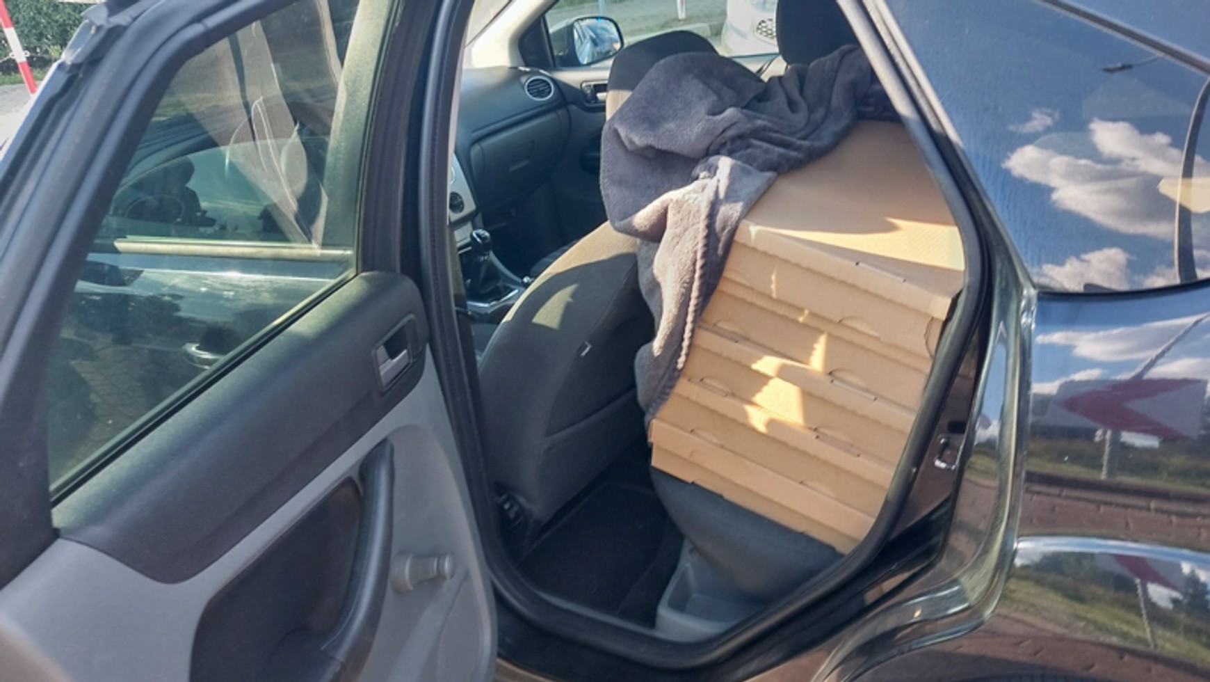 Kartony typu "pizza" znajdowały się na tylnej kanapie, przykryto je tylko kocem. Wypełniono nimi także bagażnik samochodu.