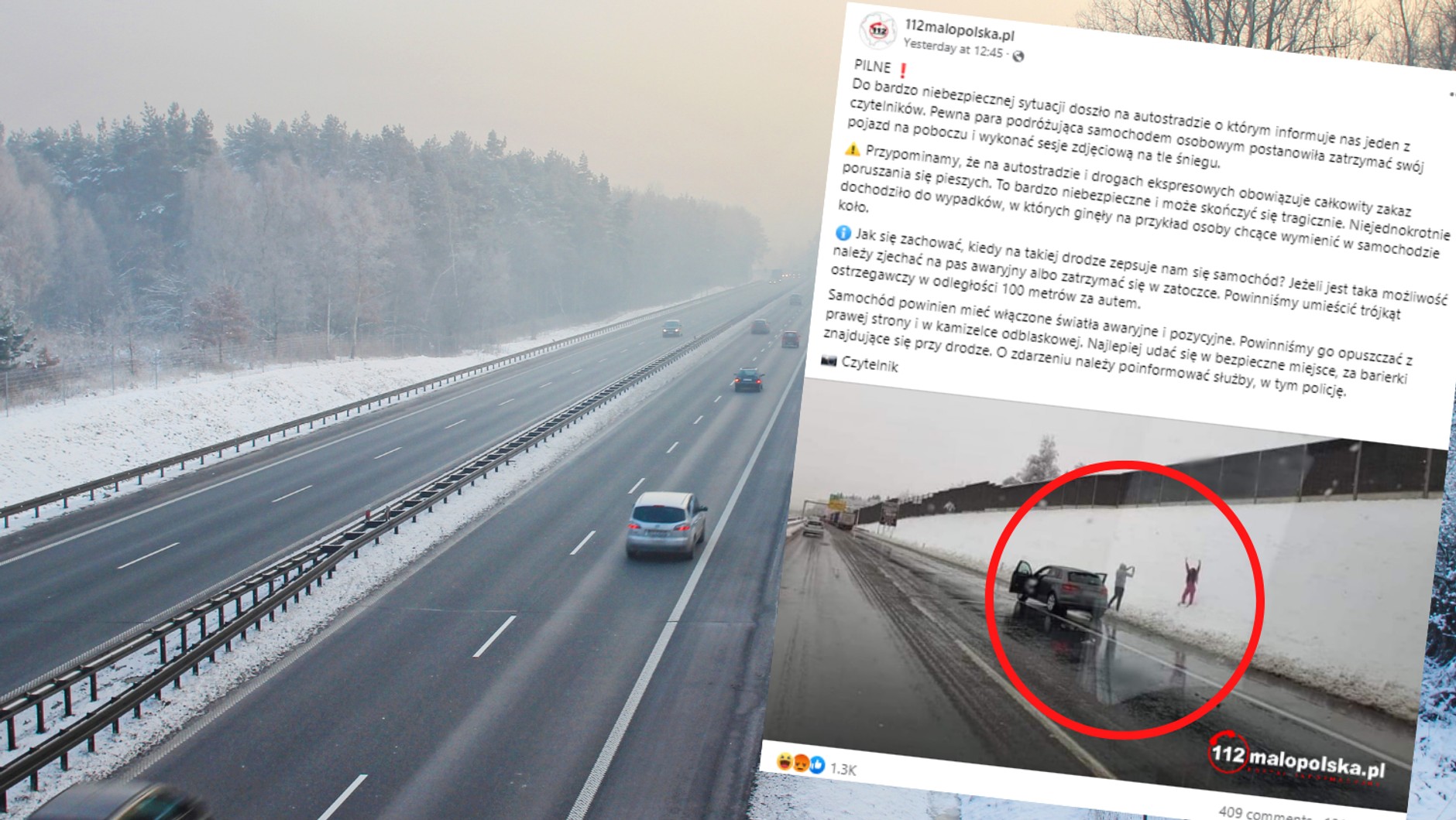 Jadący autostradą kierowca zauważył dziwnie zachowujących się podróżnych. Na zdjęciu udostępnionym na Facebooku przez serwis 112malopolska.pl możemy zauważyć, że para zatrzymała samochód na pasie awaryjnym, wyszła z niego, a następnie postanowiła urządzić sesję fotograficzną. Z obrazka wynika, że fotografowana weszła kilka metrów w zaspę, a jej partner stara się ją uchwycić w różnych pozach.