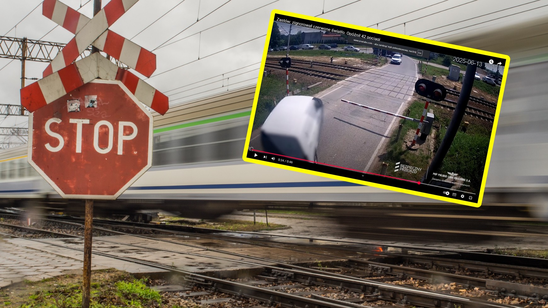 Do zdarzenia doszło 13 czerwca, jednak nagranie z monitoringu zostało opublikowane przez Polskie Linie Kolejowe dopiero niedawno. Kamera zarejestrowała, jak kierujący vanem najpierw próbuje przejechać przez przejazd mimo czerwonego światła, a następnie zostaje uderzony przez zamykającą się rogatkę. Po krótkim cofnięciu, mężczyzna przez kilka minut czekał na podniesienie szlabanów, jednak ostatecznie zdecydował się ominąć zamknięte rogatki i przejechać przez tory.