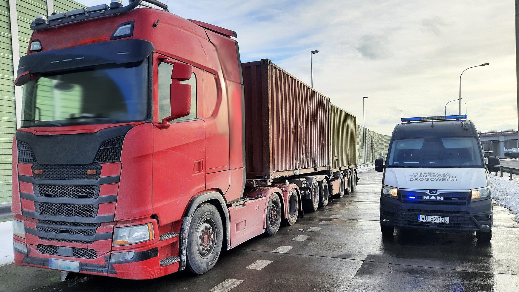 Uwagę inspektorów zwrócił już sam fakt, że zestaw składał się z trzech zamiast dozwolonych dwóch pojazdów. Kierowca przewoził nim dwa 20-stopowe kontenery z Woli Żydowskiej do Mławy. Jak się później okazało, problemem był nie tylko fakt, że taki zestaw nie miał prawa wyjechać na drogę.