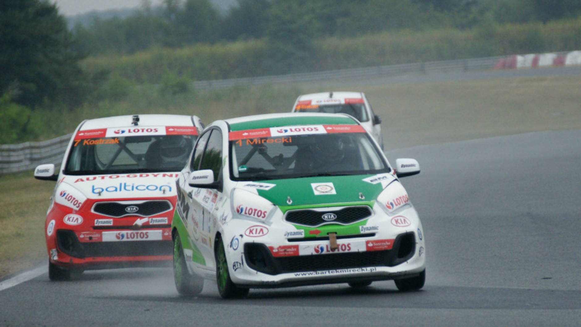 W nocy jednak przyszło załamanie pogody i 27 wyścigowych Picanto ustawiało się do startu w strugach deszczu. Filip Tokar popełnił błąd ruszając i błyskawicznie stracił pozycję lidera na rzecz Mireckiego, który prowadzenia nie oddał do mety. Mokry tor chyba trochę przestraszył kierowców, bo wbrew oczekiwaniom w tak trudnych warunkach nie przydarzyła się żadna kraksa. Poza Maciejem Dreszerem, który nie ukończył biegu z powodu kłopotów technicznych, wszystkie auta w całości dotarły do mety.