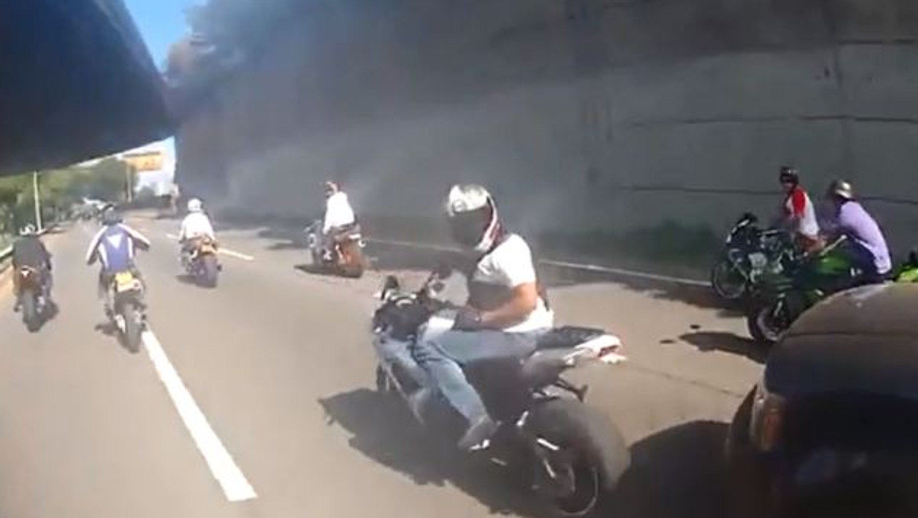 Kierowca czując się zagrożony rusza z miejsca, potrącając jednego z nich, a następnie rzuca się do ucieczki. Na końcu filmu widzimy, jak jeden z mężczyzn rozbija szybę samochodu swoim kaskiem.