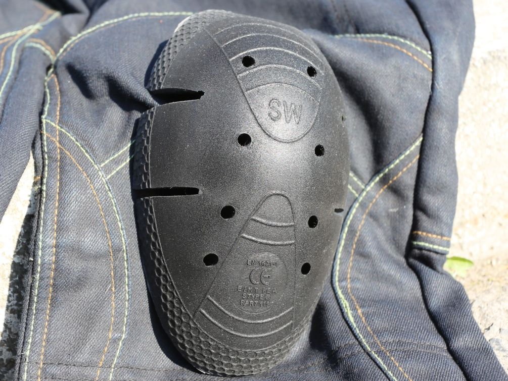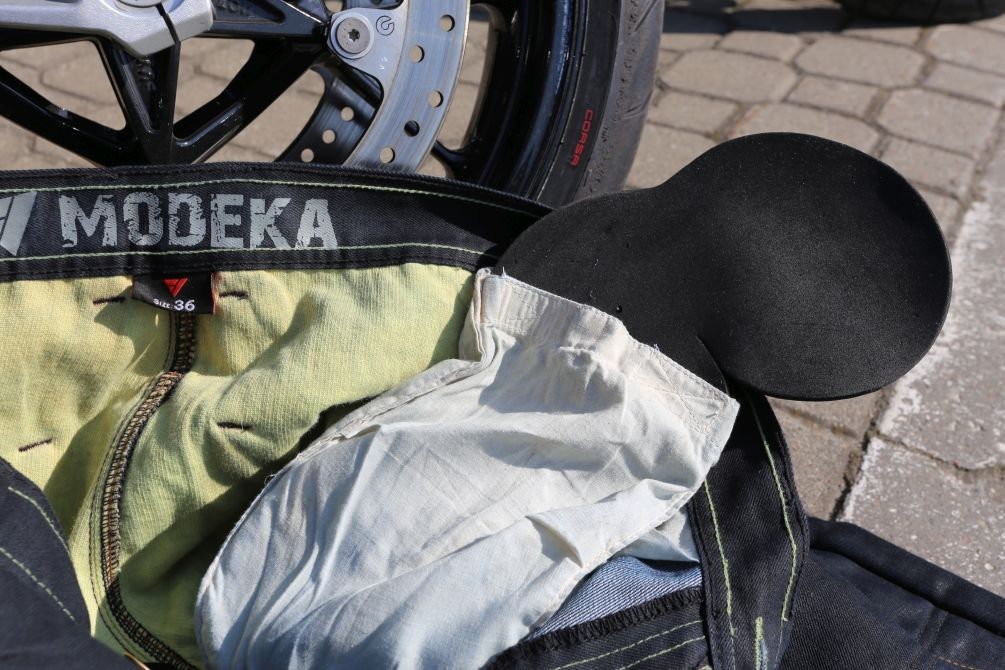 Jak wspomniałem, w najbardziej zagrożonych miejscach dżinsów Modeka Denver Wax, takich jak kolana, biodra czy pośladki, chroni nas podszewka z Kevlaru firmy DuPont, który, jak podaje producent, jest pięciokrotnie mocniejszy od stali w przeliczeniu na jednostkę masy. Kevlar jest naprawdę dobrze przyszyty i daje poczucie bezpieczeństwa. W komplecie ze spodniami otrzymujemy protektory kolanowe certyfikowane wg EN 1621-1. Oczywiście można je wyjąć, a mocowane są w kieszonkach podszycia spodni. Niestety, nie znalazłem regulacji wysokości protektorów, co jest trochę uciążliwe. Dodatkowo otrzymujemy - wykonane z pianki absorbującej uderzenia - ochraniacze biodrowe, które montowane są również w systemie kieszonek.