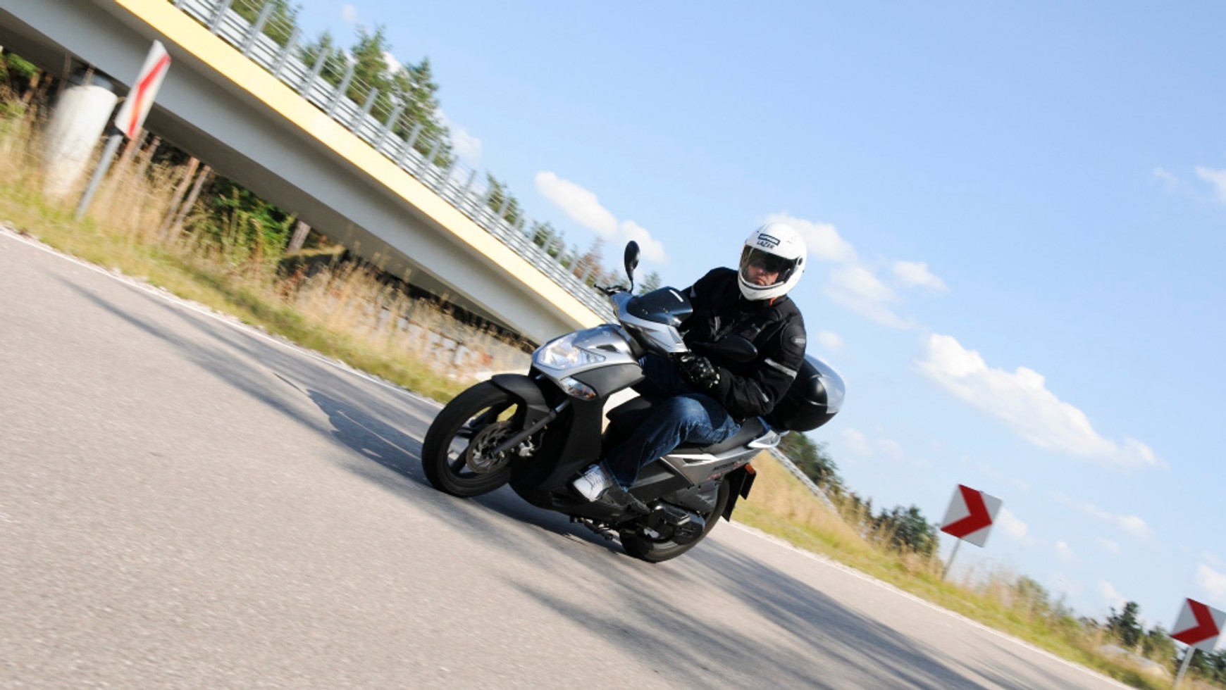 Zacznijmy od miasta. Osiągana prędkość, nieco ponad 100km/h, jest wystarczająca. Przyspieszenie do 50 km/h jest lepsze w porównaniu z przeciętnym samochodem. Koła o wymiarze odpornym na nierówności i doły, ułatwią wjazd na krawężnik i przejazd przez progi zwalniające. Szerokość pojazdu, poza lusterkami, umożliwi przeciskanie się w korkach, a kompaktowe wymiary pozwolą na zaparkowanie niemal wszędzie. Czy coś przeoczyłem? Z dostępnym kufrem i schowkami zrobimy także większe zakupy, dojedziemy do pracy i wyskoczymy pod wieczór do ulubionej kawiarni. Skromny wygląd oczywiście zmusi nas do zaparkowania 50 m dalej. Mimo to Kymco w mieście jest w swoim żywiole. Niewielkie, podmiejskie wycieczki też nie będą czymś specjalnie ciężkim. Wyjazd do nieodległego zalewu, z lepszą połówką, ręcznikami i strojami kąpielowymi? Dzięki centralnemu kufrowi spakujemy się bez problemu, a stracimy znacznie mniej czasu na zakorkowanych wylotówkach z miasta. Łatwiej także zaparkujemy. Problem pojawi się, gdy chcemy jechać gdzieś dalej. Kymco jest zbyt wolne, żeby na przykład bezstresowo poruszać się nim autostradą. Ma też niedostateczną ochronę przed wiatrem i deszczem. Zawieszenie zostało zestrojone pomiędzy komfortem a sportem, czyli umiarkowanie twardo. Dzięki temu skuter nie powala na kolana komfortem, ale w szybkich zakrętach prowadzi się pewnie. Niestety, strasznie szybko osiąga kres złożenia trąc niemiłosiernie podstawką. Jazda z pasażerem powoduje znaczny spadek osiągów – 85 km/h to maks. Zużycie paliwa, w zależności od obciążenia i sposobu jazdy, waha się pomiędzy 3.2-4.8 l/100km, przy 6-litrowym zbiorniku oznacza to zasięg 130-180 km. Warto o tym pamiętać planując trasę.