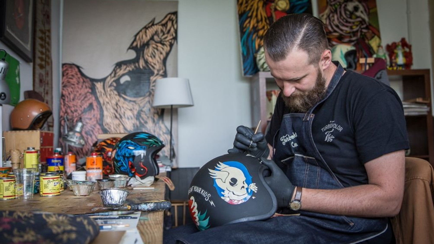 Ja z wykształcenia jestem jubilerem. Choć nigdy nie pracowałem w tym zawodzie, bardzo mi to jubilerstwo pomogło. Kiedy dziś maluję obraz, to oczywiście wymaga ode mnie techniki, muszę wiedzieć, jak działają farby i pędzle, ale kiedy przykładowo przenoszę ten mój artystyczny świat na customowe motocykle, co już nie jest malowaniem płótna, a praca musi wytrzymać warunki atmosferyczne, wtedy właśnie muszę je zrobić według zasad rzemiosła. Tak żeby były trwałe. Właśnie malowanie kasków motocyklowych to dla mnie jedną nogą sztuka, a jedną nogą rzemiosło.