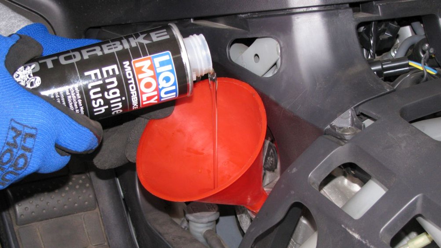 Przed wymianą oleju warto skorzystać z preparatu płuczącego Liqui Moly Motorbike Engine Flush numer artykułu 1657, który wlewa się do starego oleju, a następnie uruchamia się silnik na około 10 minut. Dzięki temu zabiegowi wypłuczemy wszystkie osady, które zalegają w kanałach olejowych i blokują prawidłową pracę pierścieni tłokowych. Zabieg ten jest szczególnie polecany do motocykli sportowych które mają wyższą temperaturę pracy oleju i czyli tam, gdzie olej może „przysmażyć „tworząc nagar. Po płukaniu i odblokowaniu pierścieni tłokowych przydymiające silniki które utraciły swoje pierwotne parametry mają szanse odzyskać dawny wigor. No chyba że silnik ma bardzo duży przebieg i związane z nim zużycie. Po wypłukaniu układu olejowego lokalizujemy korek spustowy i filtr oleju.
