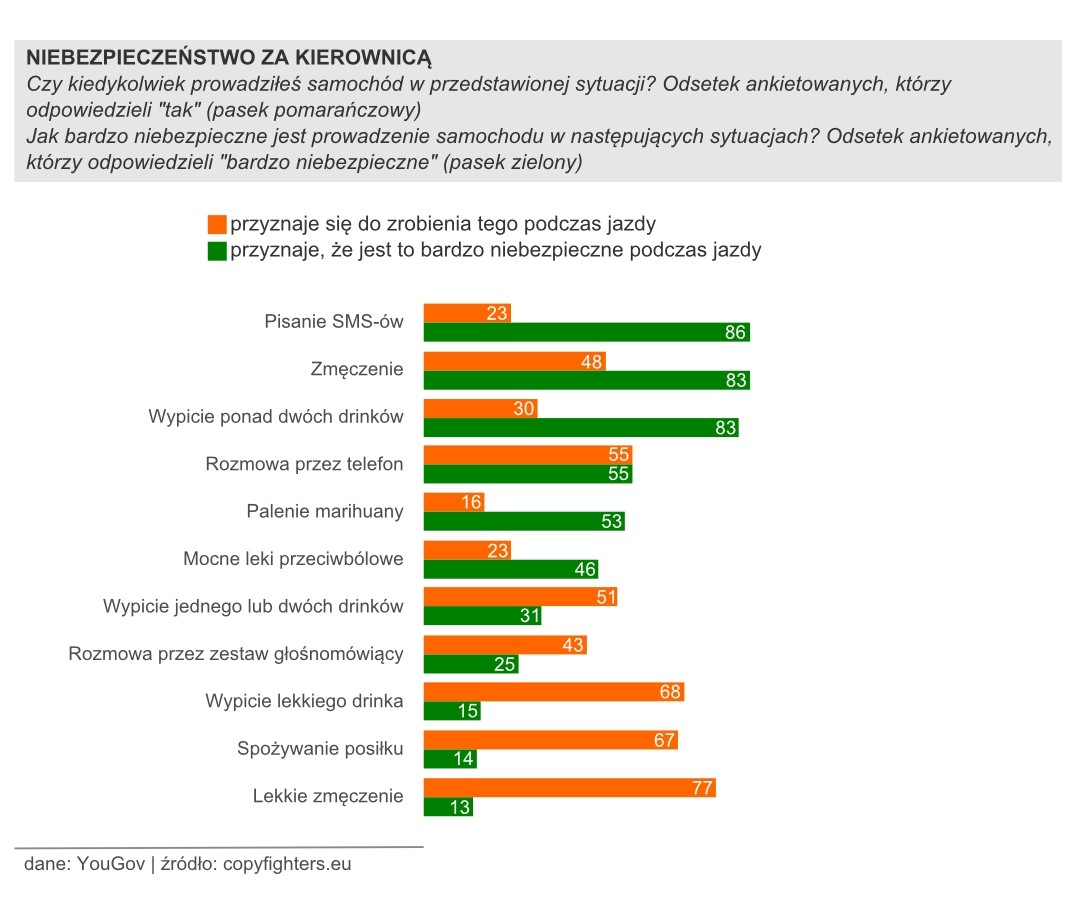 Wyniki ankiety YouGov pokazują, że jeden na sześciu kierowców rozmawia podczas jazdy przez telefon komórkowy, trzymając go jednocześnie w dłoni. Co więcej, łamanie przepisów często wcale nie wynika z nieznajomości prawa. W tym samym czasie aż 89 proc. respondentów deklaruje świadomość tego, że rozmowa przez komórkę jest obwarowana karą.
