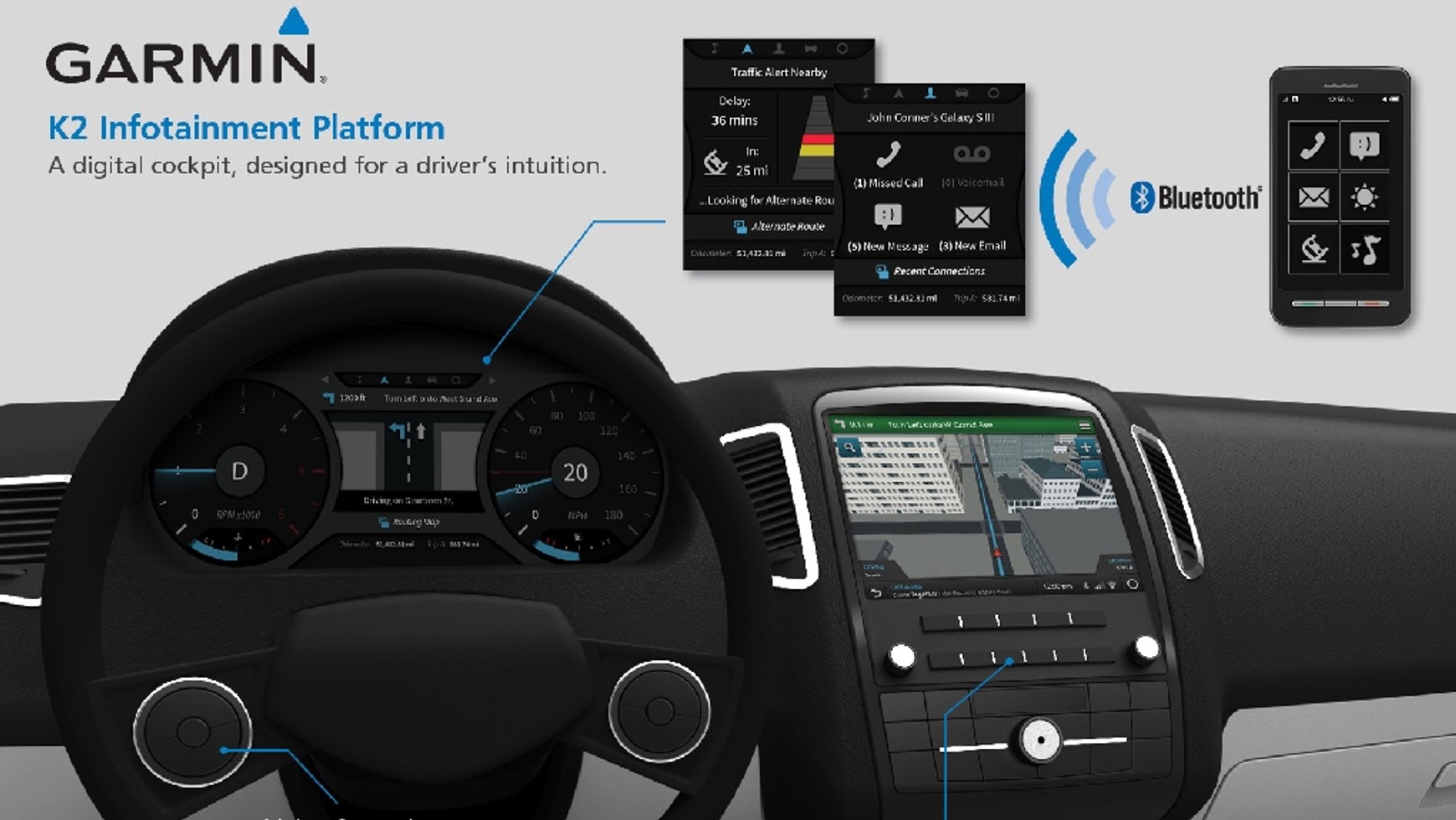 Nowa system pokładowy nie może się obejść bez nawigacji. W końcu to firmowa specjalność. Garmin oferuje nawigację 3D z obowiązkowym już wyświetlaniem realistycznie odwzorowanych budynków i skrzyżowań. W ramach ciekawych usprawnień: nawigacja automatycznie wyszukuje stacje benzynowe wzdłuż trasy, jeśli tylko otrzyma informację o niskim poziomie paliwa. Ponadto nawigacja uwzględnia zadania zapisane w kalendarzu (np. odbiór zamówionego sprzętu, obowiązkowe zakupy) i wyszukuje najdogodniejsze lokalizacje do odwiedzenia podczas podróży. System nawet może szacować czy kierowca spóźni się na ulubione spotkanie i automatycznie powiadomić uczestników o spóźnieniu.