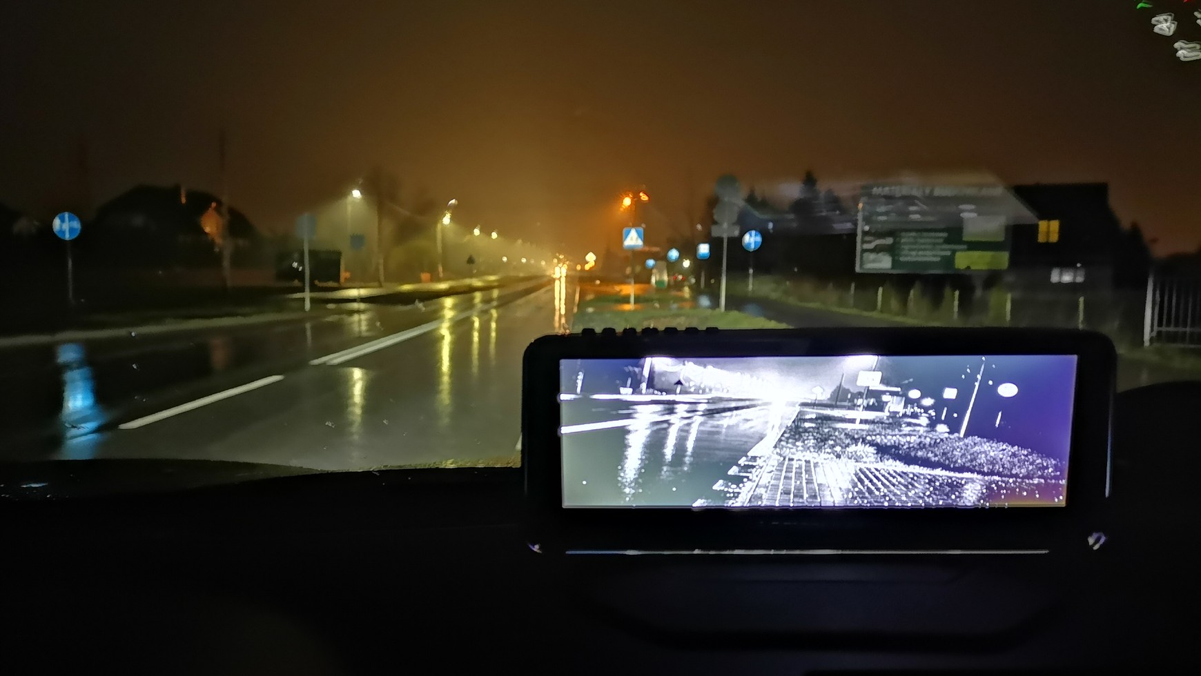 W nocy jest jeszcze lepiej, gdyż przed nami rozciąga się świetny widok porównywalny z tym jakbyśmy jechali na długich światłach (producent chwali się zasięgiem nawet do 300 metrów, co jest naszym zdaniem dyskusyjne). Co więcej, gdy zostawimy jedynie światła pozycyjne, a dookoła panuje ciemność, to dzięki kamerze łatwo dostrzeżemy wszystko co znajduje się przed autem. Niemniej do działania w nocy wymagane jest jakiekolwiek oświetlenie (wystarczą już światła pozycyjne).