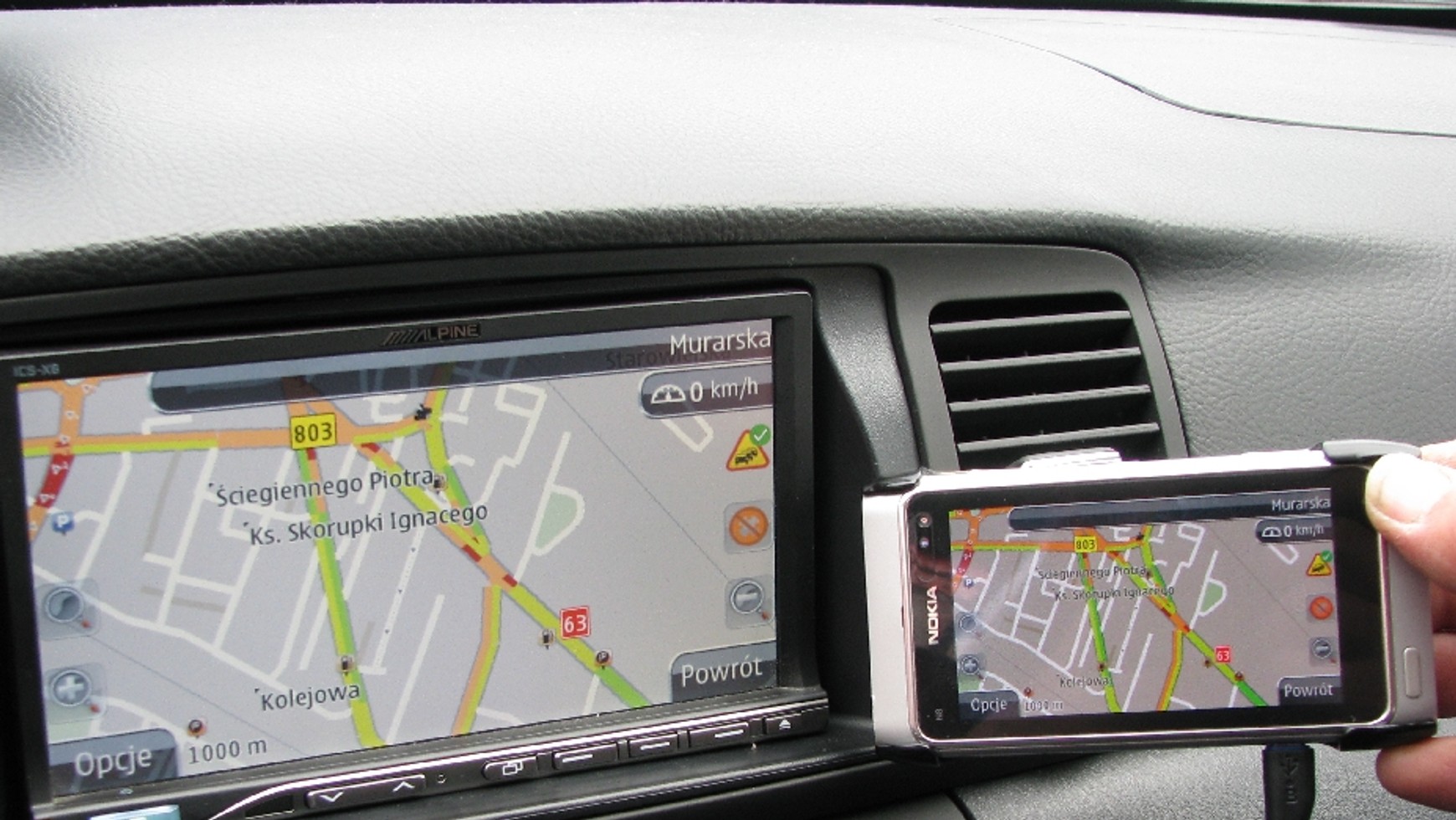 NaviExpert i MirrorLink: płynnie ale wolnoW porównaniu z aplikacją w telefonach Android NaviExpert w Nokii N8 działa bardzo wolno. Ale póki co, tylko na telefonach Nokia jest możliwe skorzystanie z połączenia z radiem w samochodzie. Płynność grafiki i map jest taka sama w telefonie i w radiu. W Alpine ICS-X8 widać jedynie nieznaczne opóźnienie przesyłanego obrazu. Najwięcej cierpliwości wymaga korzystanie z menu i wpisywanie adresu. Potem jest już tylko lepiej.