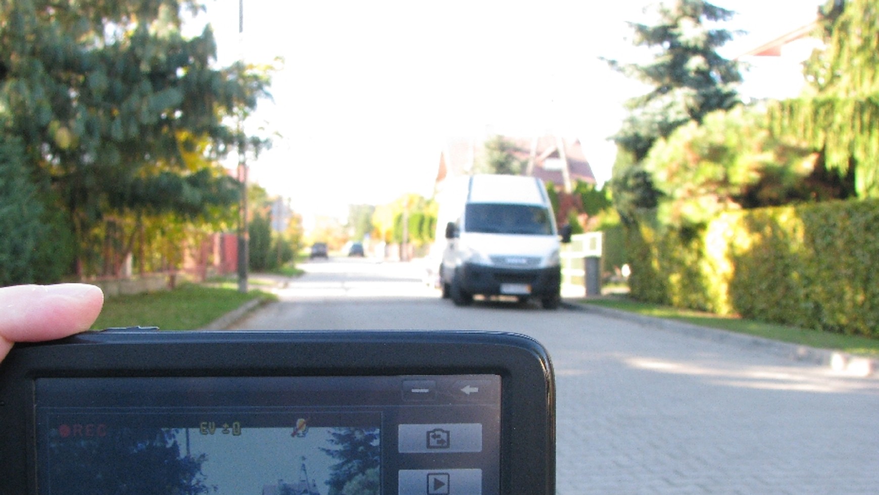 Jakość obrazuTo oczywiste: jakość nagrań zrealizowanych w ciągu dnia jest lepsza niż podczas nocnej jazdy. W słoneczne dni kamera 1 MPix dość dobrze radziła sobie ze zmianami oświetlenia (na przemian silne słońce i cienie). Kiedy przez parę minut ostre popołudniowe słońce świeciło prosto w obiektyw, kamera przez chwilę miała problem z dostosowaniem kontrastu: obraz był wyraźnie przepalony.W słoneczne dni widać także problemy z nienaturalną prezentacją kolorów podczas jazdy: jest to szczególnie widoczne na niebie. Niemniej generalnie odwzorowanie barw jest dobre. Obraz nie jest tak sztuczny jak w tanich rejestratorach.