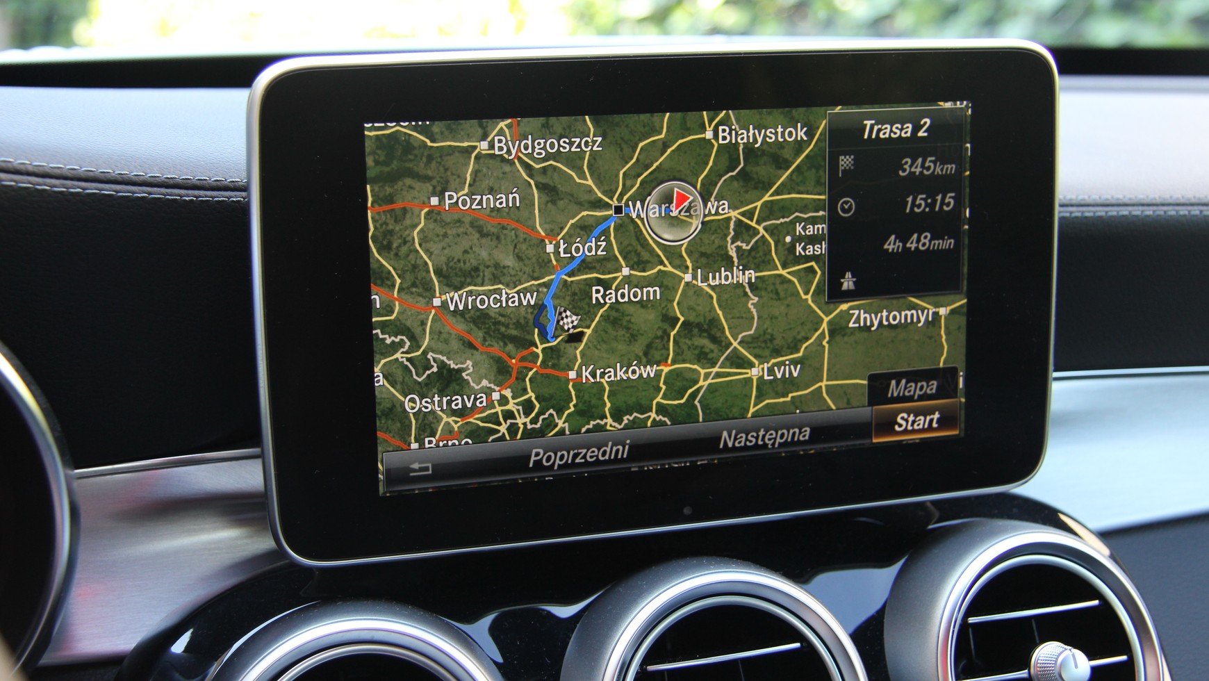 Czy mapa w nowym Mercedesie jest aż tak fatalna? Na szczęście nie. Odcinek A2 na wschód od Warszawy, czyli obwodnica Mińska Mazowieckiego jest uwzględniona w fabrycznej nawigacji. Pojedziesz również krótkim odcinkiem A4 nieopodal Rzeszowa (między węzłami Wschód i Centralny). Ale już od Szarowa do Tarnowa nie ma autostrady A4 w mapie 2013 v2.1. Na pocieszenie: z drogami ekspresowymi jest lepiej. Pojedziesz odcinkami S5 (na wschód od Poznania), S7 wokół Kielc, S8 w pobliżu Zambrowa, S19 w pobliżu Rzeszowa. Ale wokół Warszawy nie ma S2 a także S79.