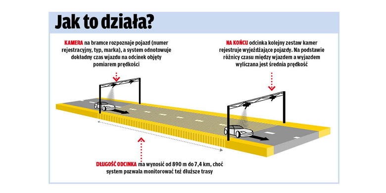 Zasada działania nowego systemu jest stosunkowo prosta (patrz też schemat poniżej). Otóż w tym wypadku mamy do czynienia z dwoma zestawami pomalowanych na żółto kamer (dzięki temu łatwo je odróżnić od miejskiego monitoringu), umieszczonymi na obu końcach odcinka pomiarowego. Kamery rejestrują drogę w obu kierunkach, więc dany fragment będzie nadzorowany w dwie strony naraz, a przejeżdżające pojazdy będą fotografowane od przodu i od tyłu.
