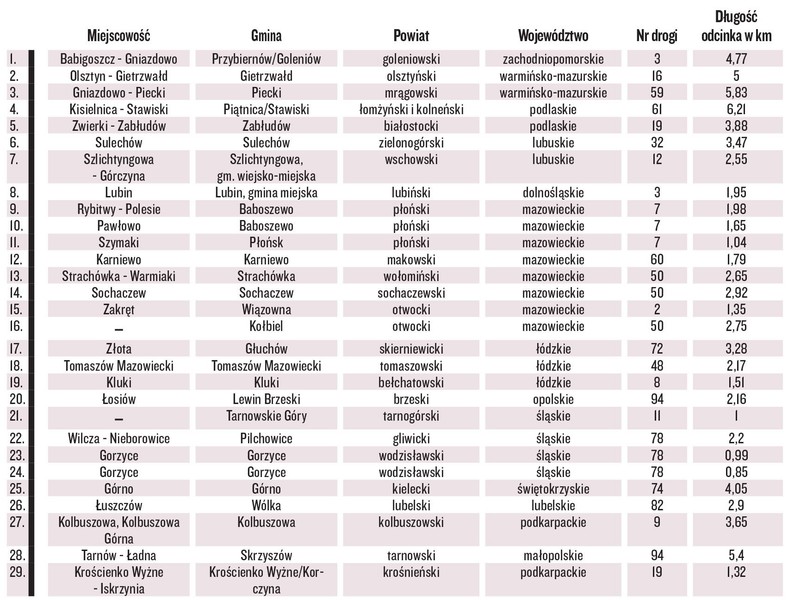 W liczbach wygląda to już całkiem imponująco, choć zapewne GITD nie powiedziało jeszcze ostatniego słowa. Na razie Inspektorat oficjalnie zapowiedział 29 odcinków kontrolnych, o łącznej długości 81,26 km – patrz mapka na s. 30. Wszystkie wytyczono na drogach krajowych i wiele wskazuje na to, że ekspresówki ani autostrady nie zostaną objęte nowym systemem. Pierwszy odcinek – w miejscowości (nomen omen!) Łosiów – rusza na dniach. Ale w związku z nowym systemem pojawia się też wiele pytań i wątpliwości.