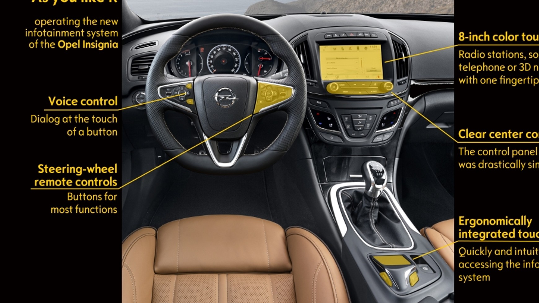 Sterowanie ma się odbywać w Oplu jednym palcem. Niemniej sprzęt jest dostosowany do technologii Multi-touch, co oznacza gesty tak jak na smartfonie czy tablecie podczas przeglądania mapy.