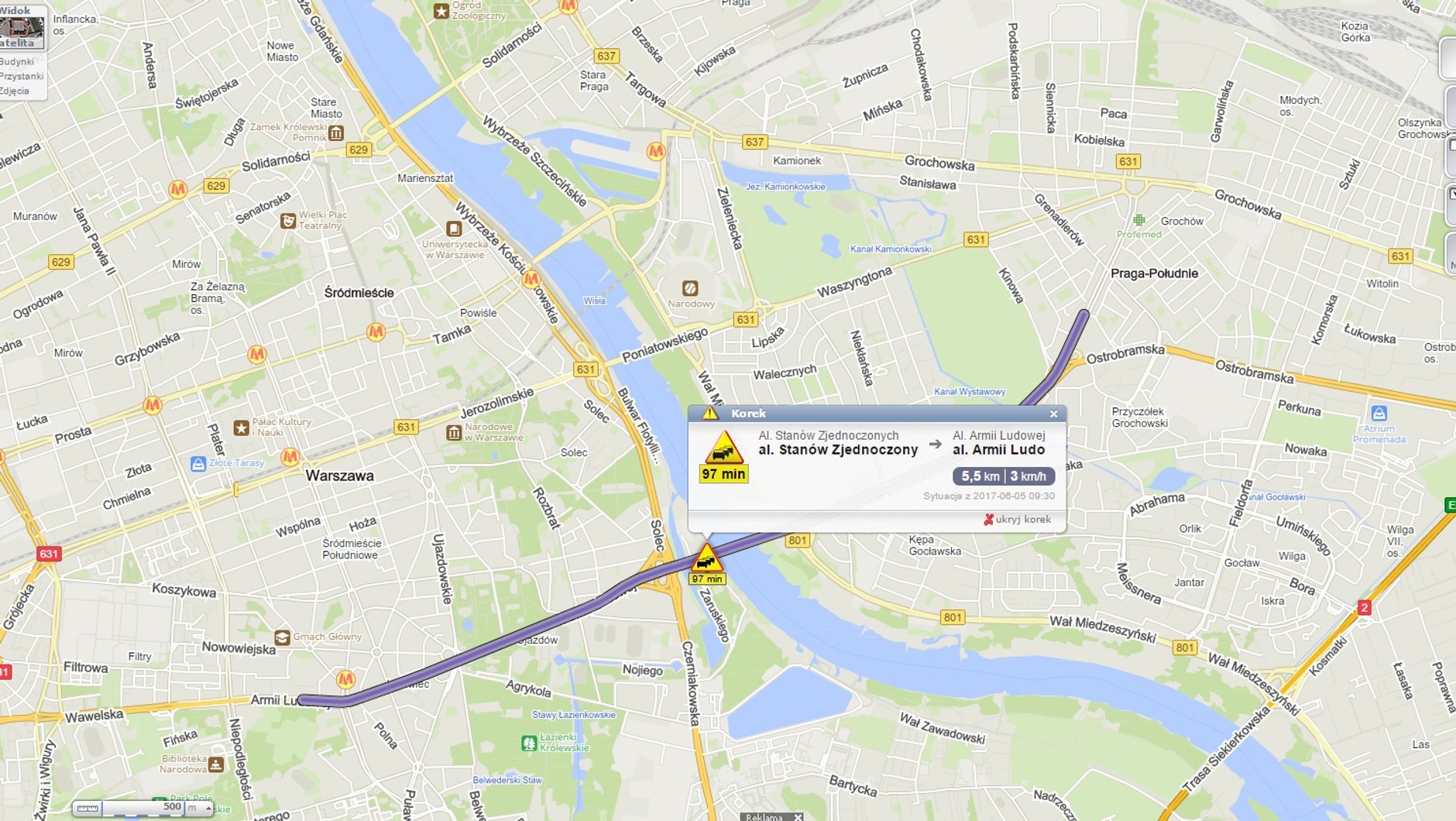 Czas stania w korkach przekraczał w wielu miejscach 90 minut. Tyle czasu potrzeba było na pokonanie np. 5,5 km odcinka trasy łazienkowskiej oraz 9 km odcinka pomiędzy ulicami Trakt Brzeski a al. Stanów Zjednoczonych. Najgorsze utrudnienia odnotowano w pobliżu popularnej trasy Siekierkowskiej. Na przejechanie 6,6 km z ul. Marsa do ul. Gen. Józefa Becka potrzeba było aż 147 minut! Ciężko dojeżdżało się w stronę centrum także ul. Puławską (9,1 km w 73 minuty), al. Waszyngtona (6 km w 73 minuty) oraz Wybrzeżem Gdyńskim (6,2 km w 76 minut).