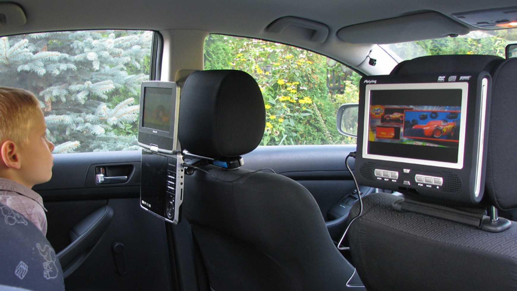 Sprzęt powinien być jak najsolidniej przytwierdzony do zagłówka, by w razie wypadku nie wyrządził krzywdy podróżującym. Zwykle do mocowania stosuje się paski na rzepy i to na co dzień wystarcza, jakkolwiek nie jest idealnym rozwiązaniem. Znacznie pewniejsze są specjalne stacje dokujące, które przykręca się do prętów zagłówka. Odtwarzacz w stacji dokującej nie tylko jest bezpieczniejszy dla podróżnych, lecz także nie wpada w drgania podczas jazdy. Najgorsze rozwiązanie to torby z rzepami do zagłówka. Trudno je porządnie zamocować do fotela, przez co zestaw ma tendencje do kołysania się i drżenia, a to utrudnia oglądanie filmów.