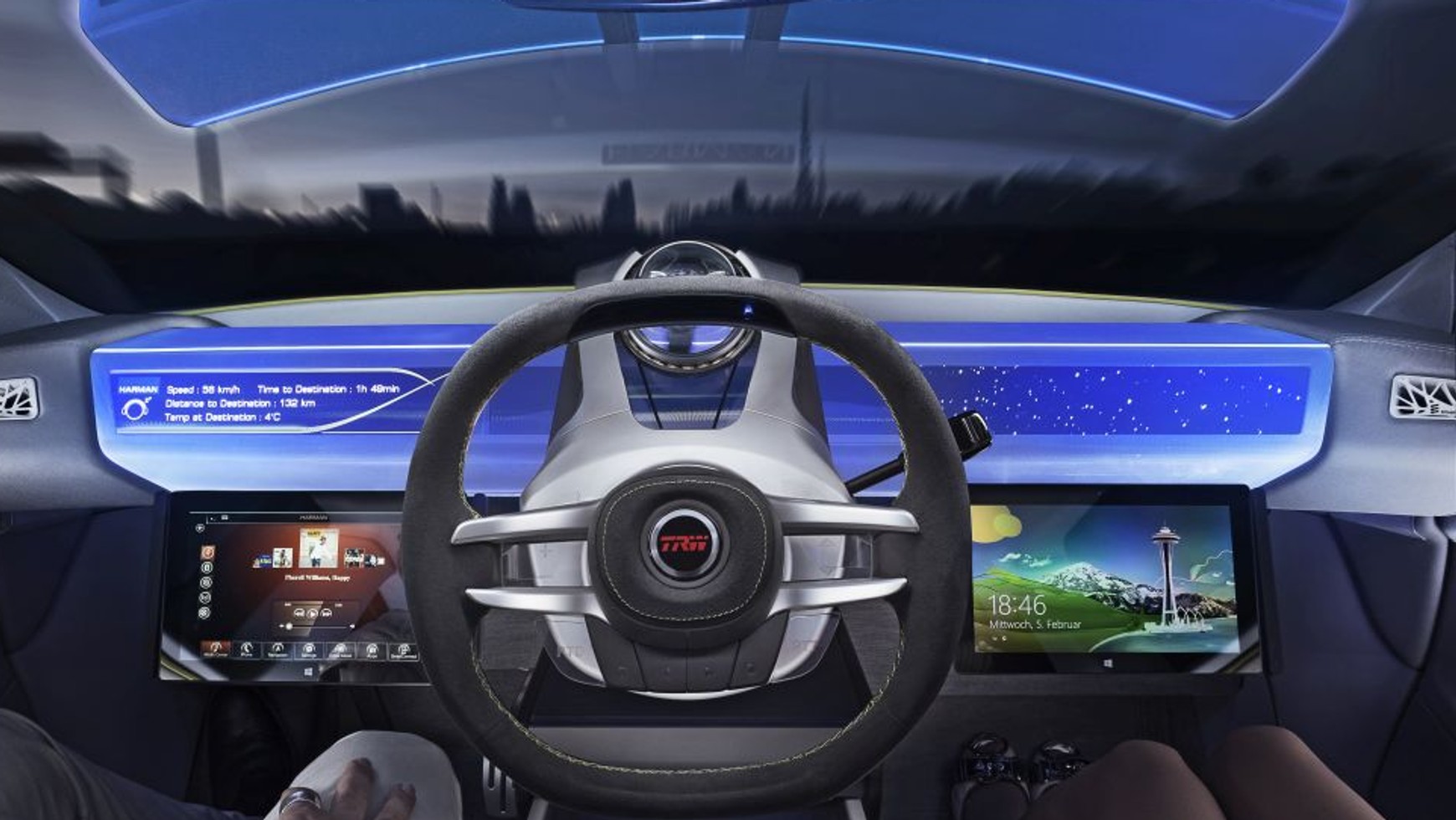 Czy w samochodzie można zmieścić wielki ekran o długości 1,2 metra? Można. W najnowszym samochodzie Rinspeed Xchange Harman zmieścił niezwykły ekran do wyświetlania kluczowych informacji samochodu, systemu multimedialnego i nawigacji GPS nowej generacji. Wzdłuż całej deski rozdzielczej. A prócz długiego ekranu jeszcze trzy dodatkowe.