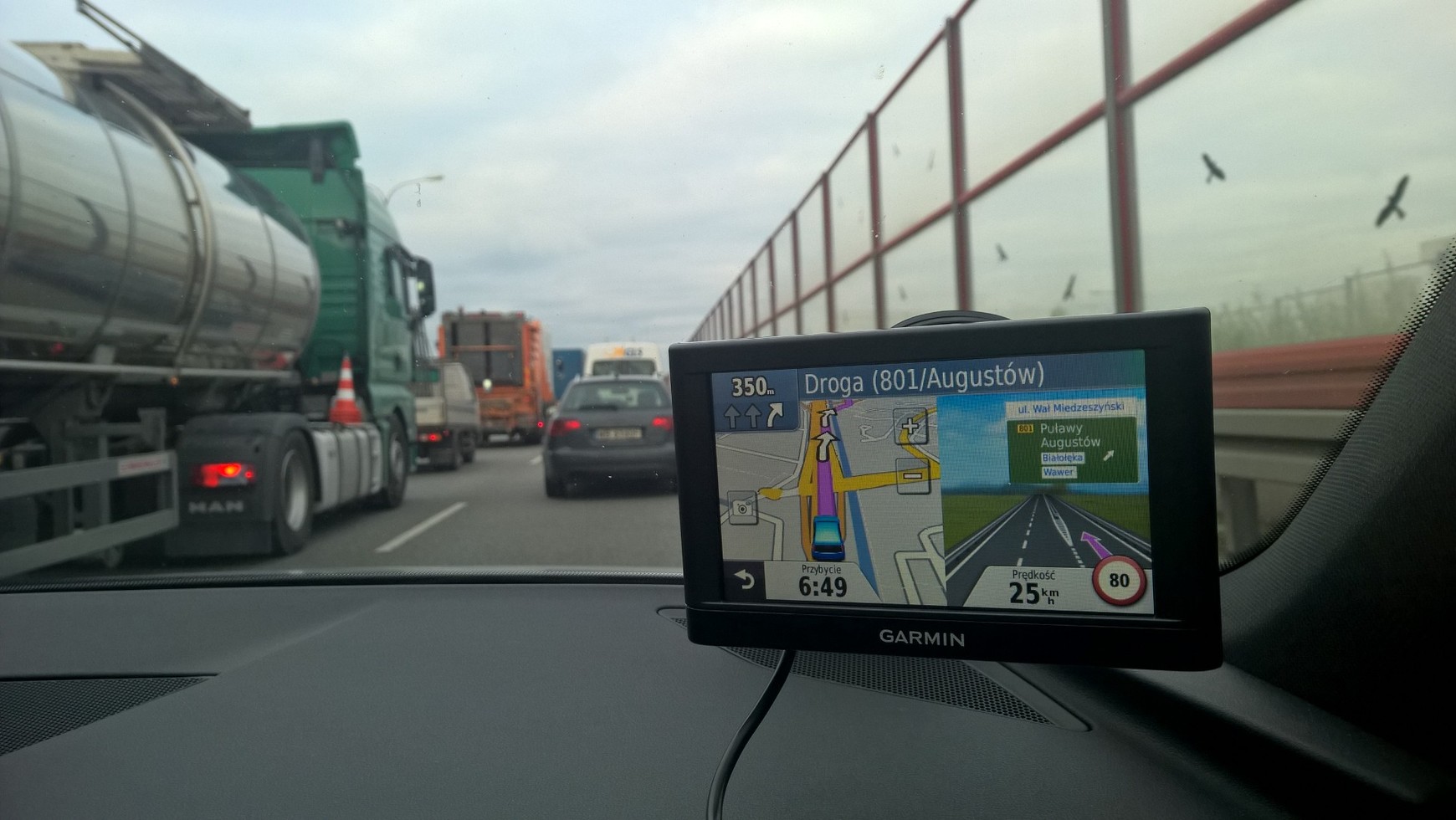 Bez wątpienia z Garminem trudno się pomylić. Choć podstawowa grafika wyświetlanej mapy to już obecnie nic nadzwyczajnego, to dodatki takie jak wizualizacja zjazdów z trasy czy skrzyżowań jest świetna. Widać nie tylko świetnie odwzorowany przebieg drogi, ale także tablice oraz strzałki asystenta pasa ruchu. Pod tym względem konkurencja ma co naśladować.