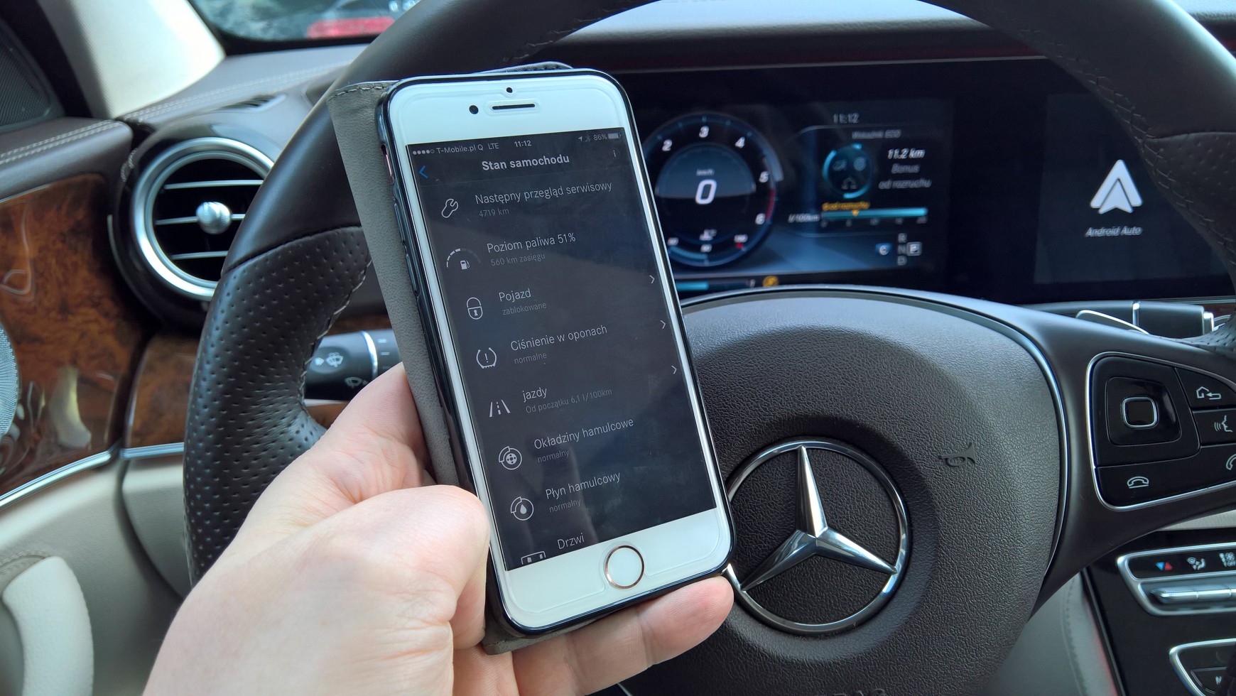 Początkowo odruch sięgania po smartfon zamiast po kluczyk wcale nie był taki oczywisty. Chyba, że będąc daleko od samochodu chcę sprawdzić poziom paliwa, ciśnienie w oponach, szacowany zasięg, średnie zużycie paliwa, informacje o klockach hamulcowych, płynach (hamulcowy, chłodzący, do spryskiwaczy), oknach, szyberdachu, bagażniku, akumulatorze czy hamulcu ręcznym. Mogę nawet zobaczyć szacowany zasięg zanim trzeba będzie się pojawić w serwisie na obowiązkowy przegląd. Pięknie. Jest jednak jeden feler. Mimo tak szczegółowych informacji nie mogę sprawdzić jednego: pozycji zaparkowanego samochodu. Póki co w testowym egzemplarzu E220 d usługa nie była dostępna. Docelowo jednak się pojawi.