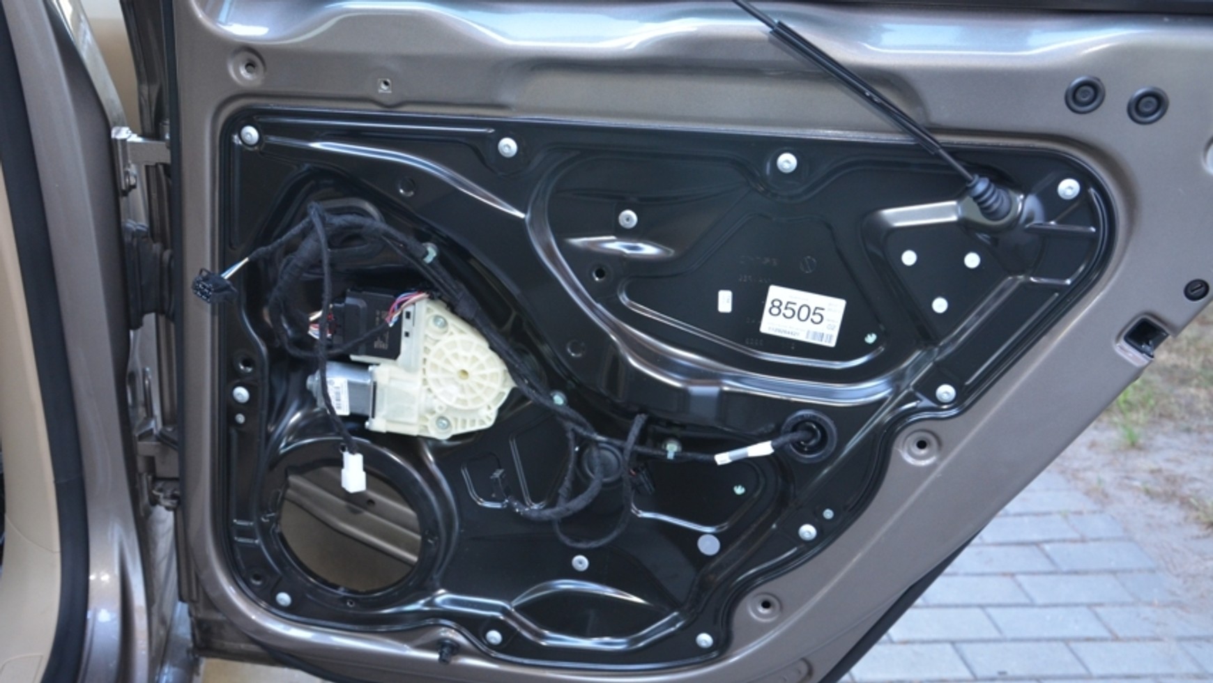 Przednie drzwi w Passacie B7. Po zdjęciu boczka widoczna jest nitowana blacha z przymocowanym osprzętem. Warto ją pokryć matami tłumiącymi w przypadku instalacji głośników wyższej klasy.