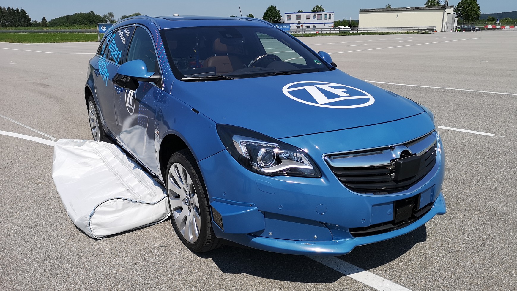 Koniec teorii – pora na test praktyczny. Na demonstrację nowego układu wybraliśmy się na tor testowy w Memmingen na południowo zachodnim skraju Niemiec. Na płycie czeka na nas wypełniony po brzegi sprzętem Opel Insignia kombi oraz zdalnie sterowana mobilna platforma z makietą przypominającą Mercedesa Klasy C, czyli przysłowiowy czarny charakter - sprawca zderzenia bocznego. Nie sposób przeoczyć także rozstawionych dodatkowych anten podobnych do tych z których korzystają geodeci. To tzw. różnicowy system GPS, dzięki któremu można uzyskać znacznie lepszą precyzję pozycjonowania. Insignia jak i platforma poruszają się bowiem samodzielnie – o kaskaderze za kierownicą nie ma mowy.