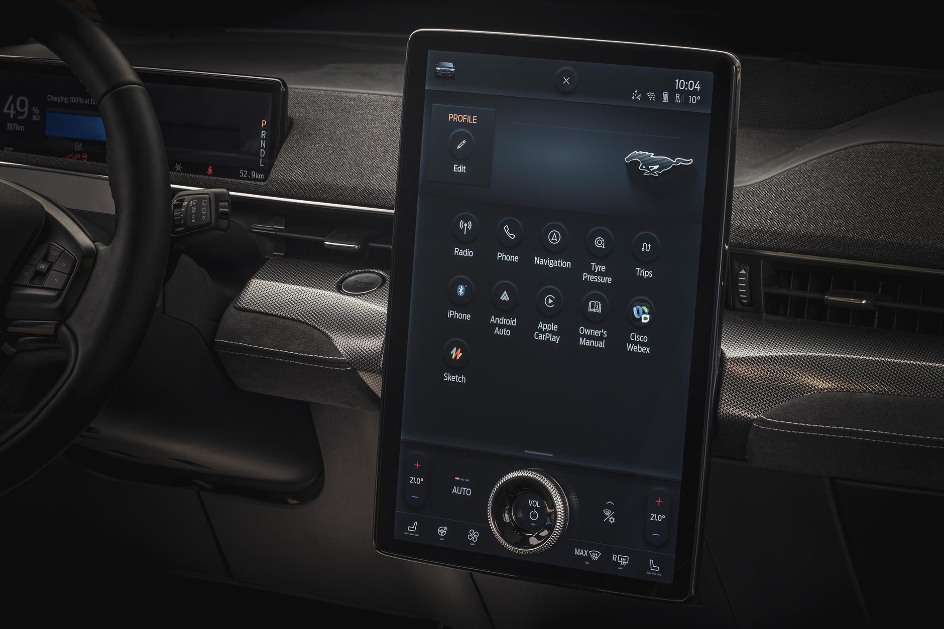 Na dodatek Mustang Mach-E doskonale zintegruje się z twoim smartfonem. Samochód wyposażono w bezprzewodową łączność z systemami Apple CarPlay i Android Auto, bezprzewodowo ładuje się w nim też telefony z ładowaniem indukcyjnym. Wybrane funkcje smartfonu obsługuje się za pomocą ogromnego i wygodnego 15,5-calowego wyświetlacza w centralnej konsoli.