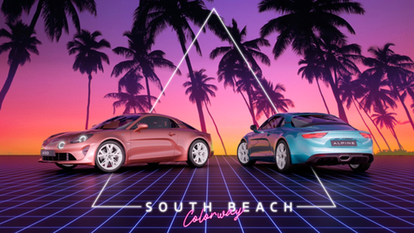 South Beach Colorway to kombinacja kolorystyczna dla A110 dostępna w dwóch wersjach, niebieskiej Bleu Azur oraz różowej Rose Bruyère. Z zewnątrz auto otrzyma również specjalne niebiesko-różowe flagi na słupkach C oraz 18-calowe białe felgi Serac. Pakiet South Beach to także ciekawe dodatki wnętrza. Wśród nich klienci znajdą dedykowane dywaniki podłogowe South Beach haftowane w kolorach nadwozia, a także te same niebiesko-różowe flagi na boczkach drzwiowych. Całości dopełnią jasnoszare przeszycia foteli i skórzana konsola środkowa. Specjalna kolorystyka powstała dzięki programowi personalizacji samochodów zwanym Atelier Alpine.
